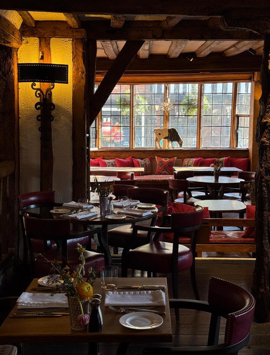 followed by creamy rice pudding with marigold sabayon and a burnt butter cracker dusted with fig leaf powder. The cheese course proved equally memorable: a generous slice of toasted malt loaf soaked in local cider brandy, topped with oozing Bath Soft Cheese. Throughout the evening, the theatre of the kitchen remains captivating, with even the cleandown a spectacle to behold.