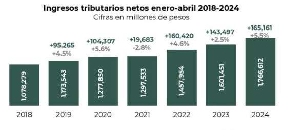 Lo cual significó aumento de 5.5% considerando el efecto de la inflación, que en términos absolutos fueron 165 mil 161 millones de pesos más si se compara con igual periodo de 2023.