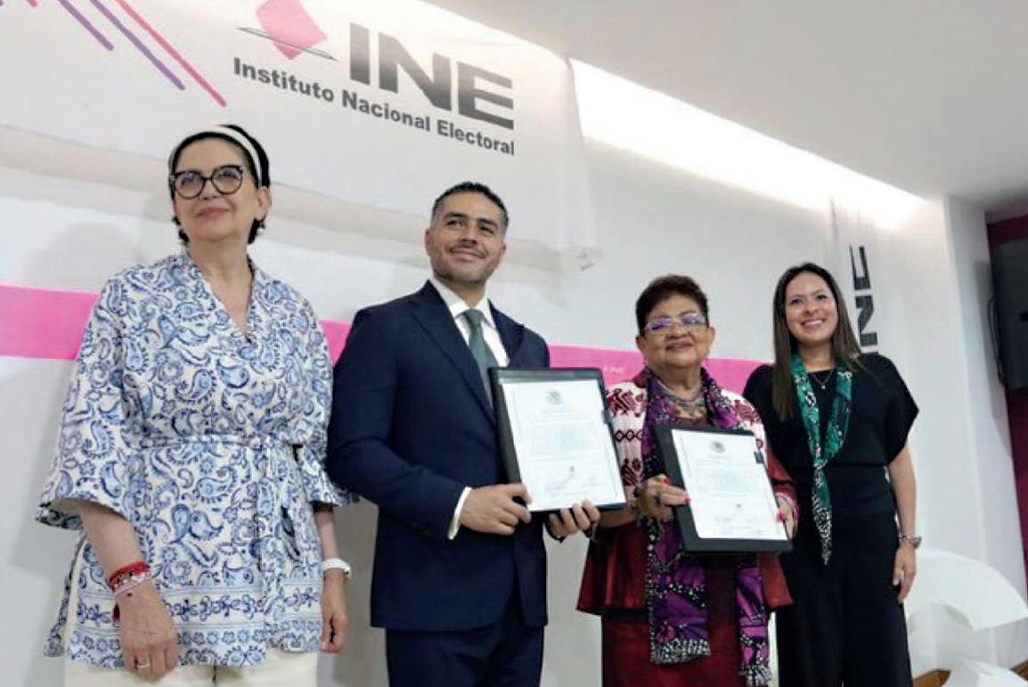 DE ÚLTIMA HORA. el Instituto Electoral de la Ciudad de México aprobó dar 5 diputaciones plurinominales más a Morena y sus aliados, con lo que pasó de 38 a 43, a una curul de lograr la tan polémica mayoría calificada que da el poder para realizar modificaciones constitucionales. En la imagen, al centro, los morenistas Omar García Harfuch y Ernestina Godoy, al recibir su constancia de mayoría como Senadores por la CDMX. Cortesía. P. 10