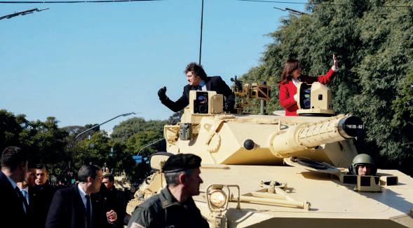 Al cierre de la parada militar, en la que participaron más de siete mil efectivos que marcharon sobre la Avenida del Libertador, en Buenos Aires, el mandatario y la vicepresidenta, Victorial Villarruel sorprendieron a los asistentes al descender del palco oficial y subir a una tanqueta de guerra en la que desfilaron y saludaron a la gente que se dio cita.