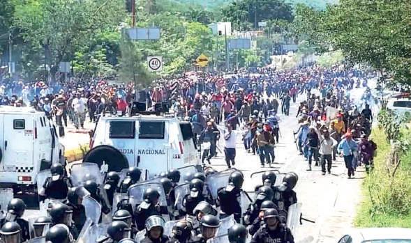...Y BLOQUEAN AUTOPISTA DEL SOL. Al menos 5 mil habitantes de diferentes comunidades de Quechultenango, Mochitlán, Chilpancingo, Mazatlán, Palo Blanco y el Ocotito se enfrentaron con miembros de la policía local y la Guardia Nacional, replegando a estos. Armados con piedras, palos y machetes llegaron hasta el Congreso e irrumpieron en las instalaciones apoyados en un camión tipo ‘Rino’ que habían arrebatado a los uniformados. Demandan la liberación del líder transportista Jesús Echeverría Peñafiel, ligado con el grupo criminal de la región ‘Los Ardillos’. La alcaldesa Norma Otilia Hernández culpa de la violencia a “fuerzas oscuras y perversas”. Foto: Cuartoscuro. Pág. 8