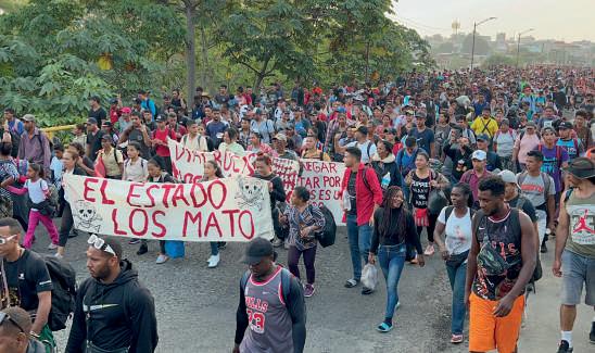 CIENTOS DE MIGRANTES de Centro y Sudamérica forman parte de una caravana que pretende llegar a la frontera de México con Estados Unidos. Durante su trayecto protestan por la muerte de los 40 migrantes en el incendio en un centro de detención en la ciudad norteña de Juárez, Chihuahua. Ayer, en su paso por Tapachula, Chiapas, sur de México. Foto: AFP Pág. 5