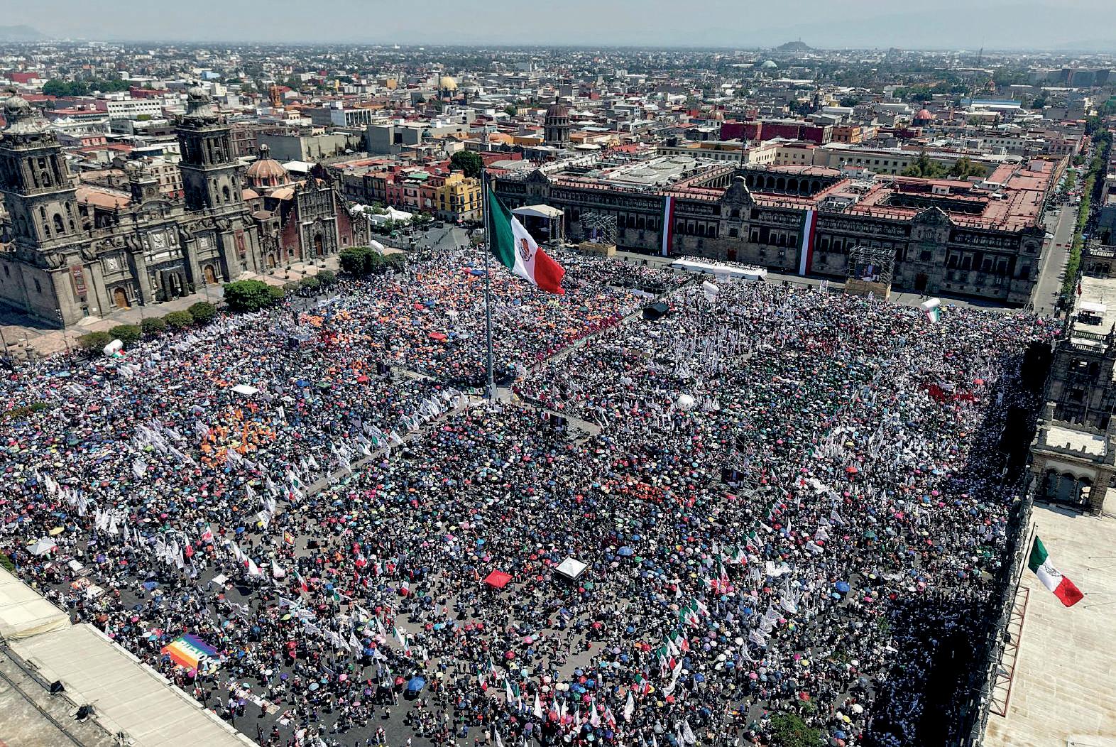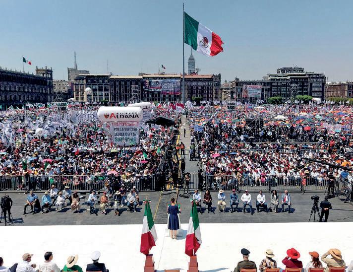 •La presidenta de México, Claudia Sheinbaum, volvió a mostrar su fuerza al reunir a más de 350 mil personas en la plaza pública más grande del país, el Zócalo capitalino. Llegaron de todas partes para mostrarle su apoyo en los momentos complicados que se viven por las negociaciones que sostiene con el presidente de Estados Unidos, Donald Trump, por la aplicación de aranceles. Este conflicto le ha permitido aumentar la aprobación ciudadana, mientras que la oposición no logra articular alguna estrategia que le permita bajarla de ese pedestal del 80% de aprobación de la que goza la mandataria federal.