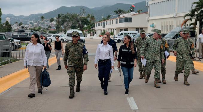 LLAMADO A LA POBLACIÓN Ante la cercanía de la depresión tropical ‘Once-E’ a las costas de los estados de Guerrero y Oaxaca, la presidenta Claudia Sheinbaum llamó a los habitantes de estas entidades a estar atentos a las intensas lluvias que se precipitarán. A las personas que habitan en zonas de riesgo les pide reubicarse en lugares altos y, de preferencia, acudir a los albergues. Sobre los daños causados por ‘John’ en Guerrero y Michoacán, la mandataria urgió a restablecer el abasto de agua y de caminos. La imagen, en Acapulco. POR ELIA CRUZ CALLEJA. Foto: AFP. Pág. 5