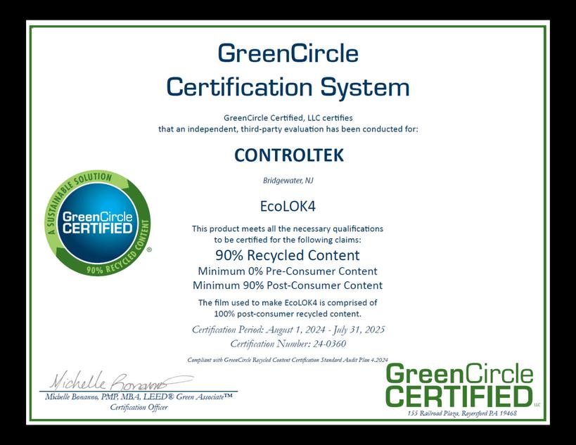 At CONTROLTEK, we understand the importance of third-party verification to ensure our clients remain confident in the integrity and accuracy of our product claims. EcoLOK4 is GreenCircle Certified as 90% Post Consumer Recycled content.