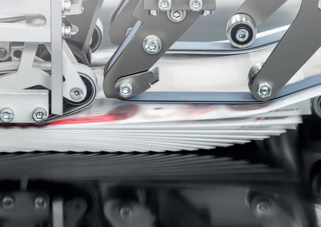magazzino superiore e inferiore e vengono allineati con estrema precisione in un processo lineare. Un dispositivo brevettato allinea i fogli con una precisione al millimetro e assicura questa precisione a velocità elevate. L’elevato livello di automazione riduce i tempi di avviamento, arrivando a quelli di una macchina standard.