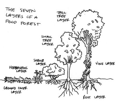 Forest gardens, including food forests, make the most of available nutrients and resources on a site by maximizing vertical space with seven key layers that extend from the deepest roots to the tallest canopy in the system. Strategic siting of species enables resources such as sunlight, water, and nitrogen to cycle through the system efficiently and helps to increase food production while building a diverse community that is more resilient to pests and climate change by building and maintaining its own microclimates at different layers.