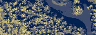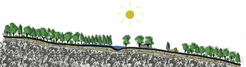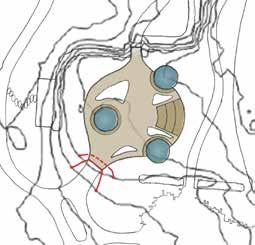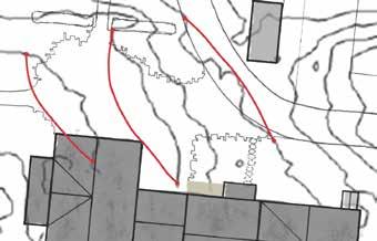 Slopes less than 5% allow circulation to be anchored by a north-south corridor of five-foot-wide, wheelchair-accessible pathways that connects the main program areas on site, from the healing hut and tiny houses in the north and the food forest and trail network in the south. Accessible offshoots from the main corridor connect visitors to the sauna, wooded workshop yurt, and fire pit. Meandering paths in the meadow provide visitors the chance to wander and find more private seating areas for reflection or small group activities. For more information on circulation and accessibility, see page 11.