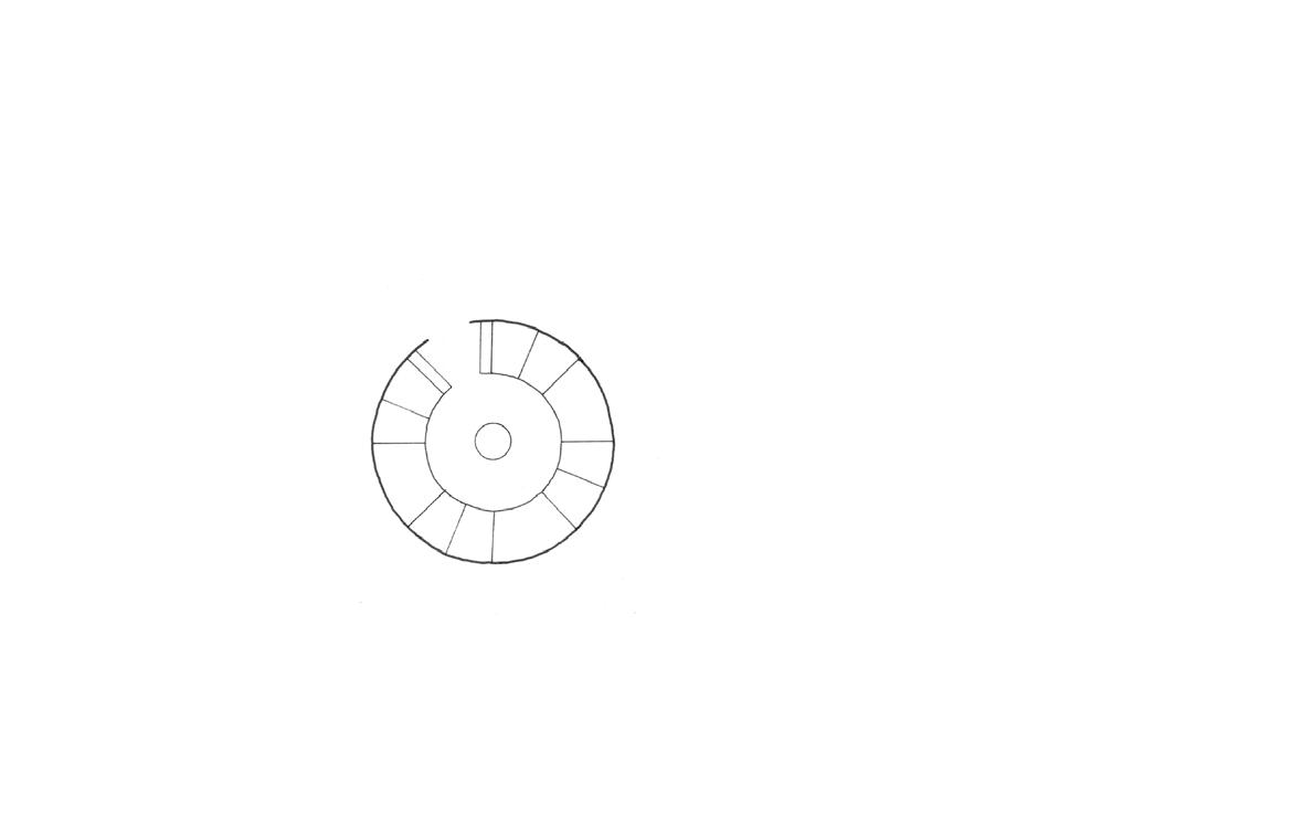 A shared shower house is located just south of the tiny house clusters. It is a circular building providing eight showers, three toilets, and sinks. A small patio courtyard lies to the northwest of the building. Water lines are extended to this point on the property to supply the showers, toilets, and sinks. All buildings north of the shower house operate with rainwater systems and composting toilets. The shower house is sited in a location that is accessible to guest accommodations, the workshop at the edge of the woods, and the central program areas.