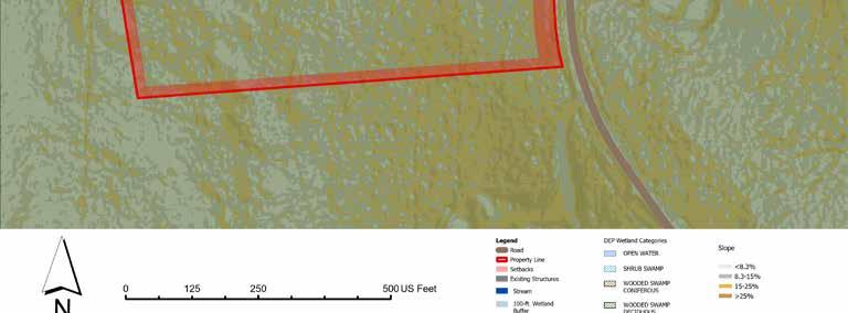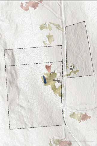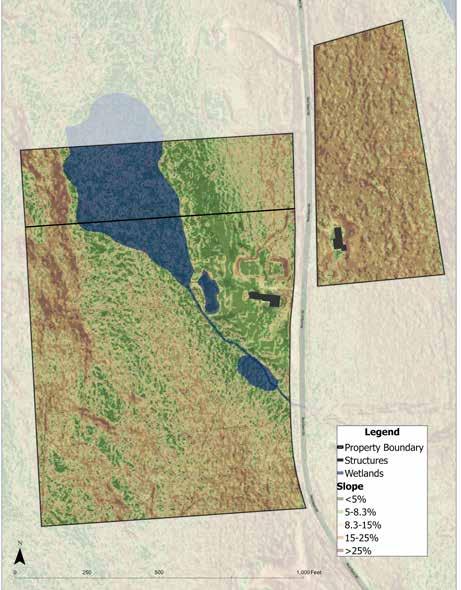 Nestled in the rolling Berkshire Hills, most of the site sits on moderate to steep slopes, with the steepest conditions on the eastern parcel. A band of milder slopes bisects the two western parcels, primarily located under the wetland areas and around the existing farmhouse.