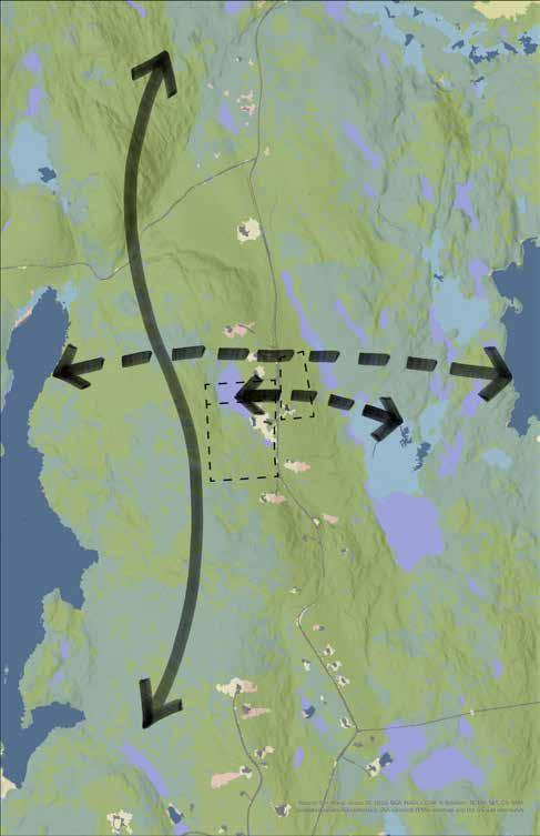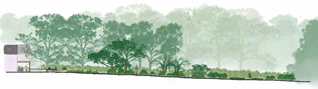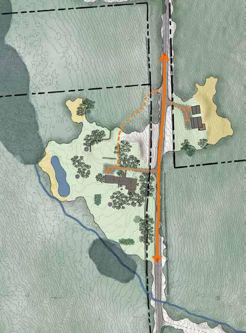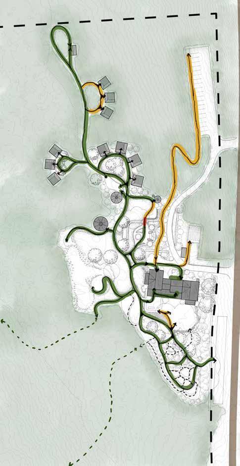 Legible and accessible pathways are essential when welcoming guests to the site, and for the flow of programming as workshop participants travel between different program areas throughout their stay. For both the arrival experience and the network of pathways connecting program areas, routes are direct yet experiential, inviting guests into the meadows and woods rather than circumventing them, integrating the landscape with the pedestrian experience. Key thresholds are located between program areas, allowing guests to decompress and transition between parts of the day, or take a moment to connect with the landscape. While visitors move, whether it be from the parking lot to the welcome patio, or the dining hall to the tiny house village, they are invited to immerse themselves in a landscape that engages all the senses, from striking visual displays to a wide variety of edible plants.