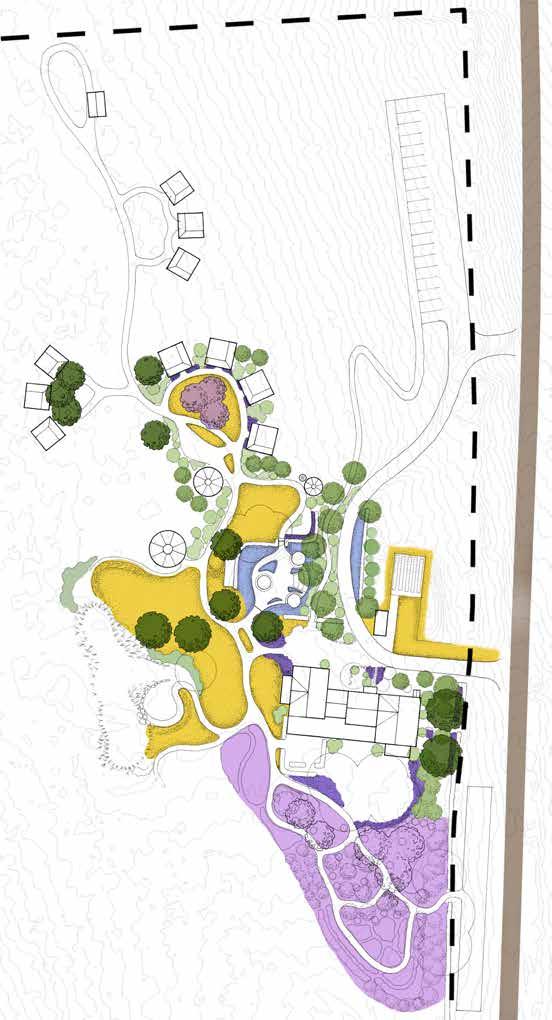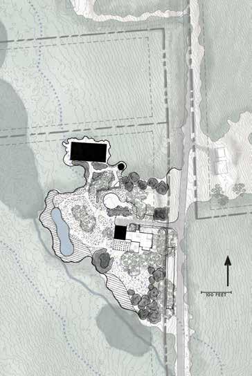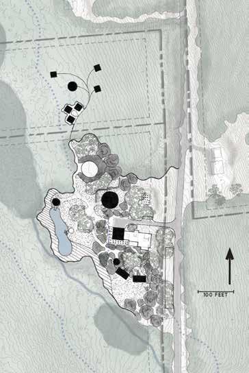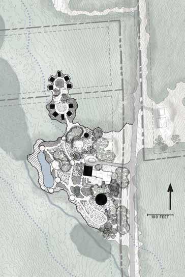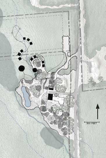 This final design, in two phases, centralizes program areas around the house, defines circulation patterns, provides visitors with a range of lodging options, and defines space for shared and private experiences. Raised garden beds and native foodscaping encourage dynamic interactions with plants and provide seasonal harvest for meals shared during workshops. Immersive spaces in or near the woods, the pond, the meadow, and the food forest engage visitors and showcase a wide range of indigenous plants that provide a variety of sensory interest and support wildlife.