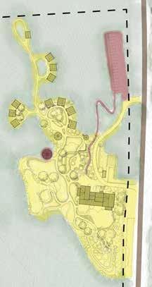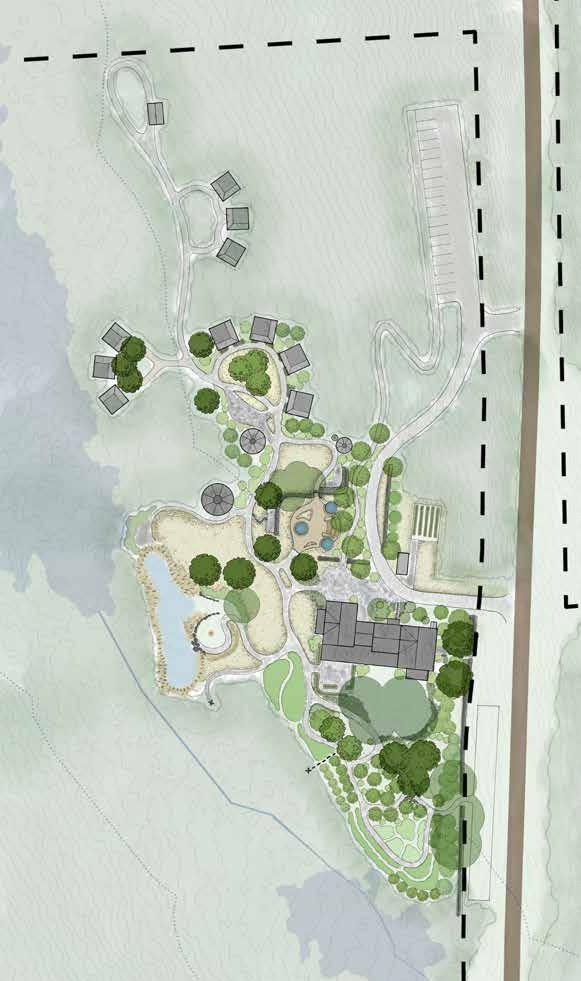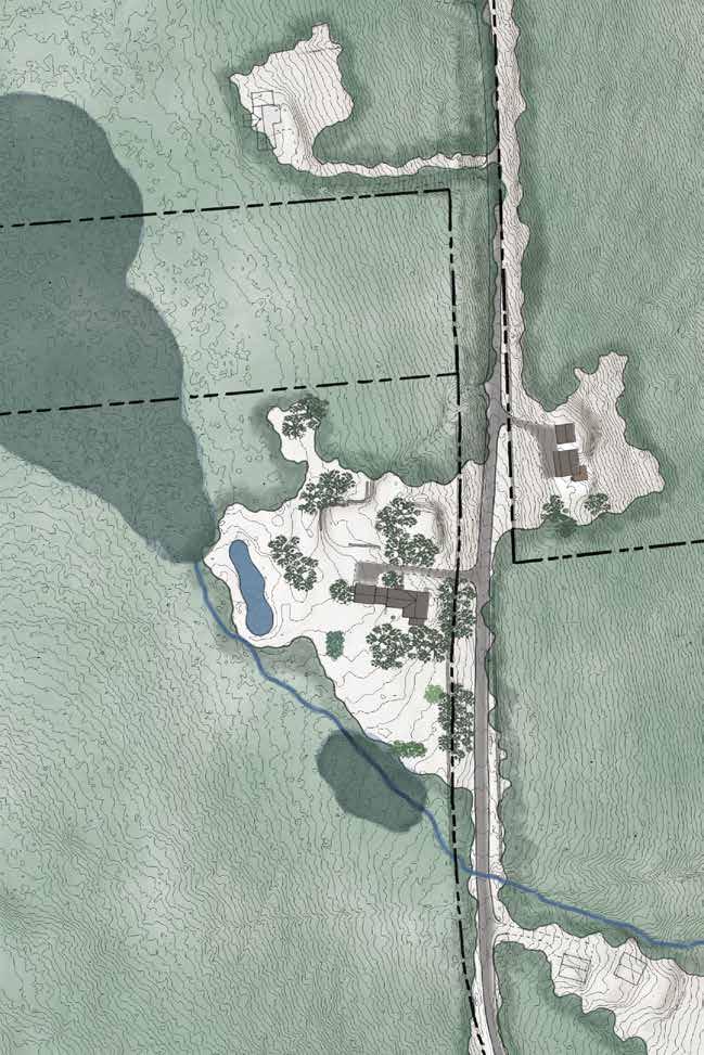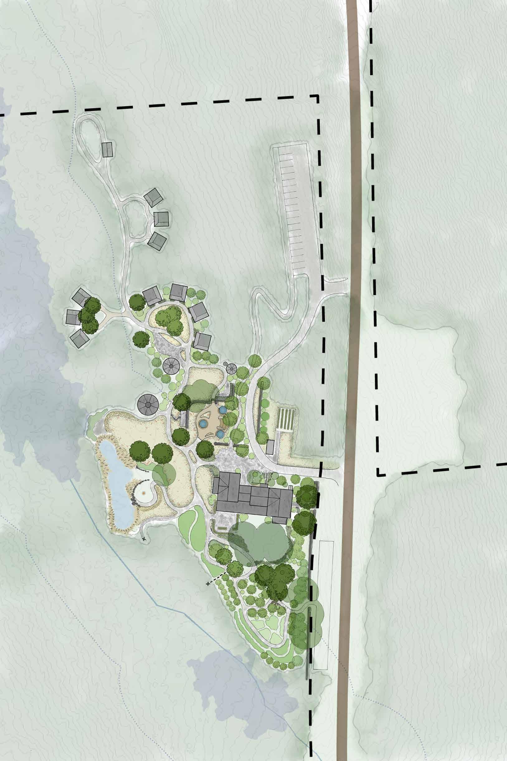 This design offers visitors a variety of lodging options, with tiny houses clustered in open and wooded spaces, as well as more remotely in the forest for a more private experience. A dock and wading area allows visitors to engage with the pond, while the main gathering space is nestled among berry bushes and fruit trees.