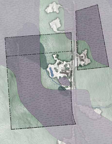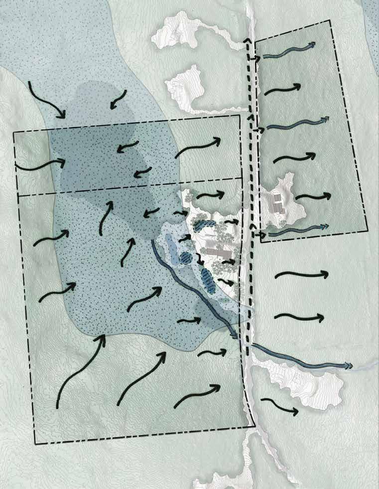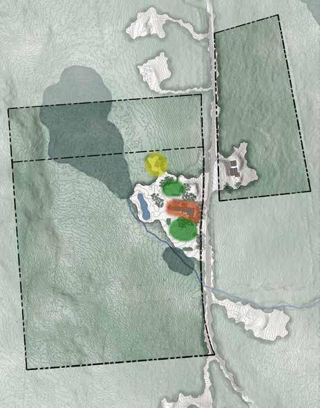 Program areas are centralized near the heart of the site, with dining taking place on the first floor of the renovated garage, and the second floor used as workshop space in phase one. A 30-foot circular yurt, nestled in the woods, will host workshop sessions in phase two of the design. An "aquatheater" combines amphitheater-style seating with three small swimming pools for water-based somatic modules, nestled in wet meadow and slightly elevated to avoid pooling water in the foundation. A 15-person sauna sits just steps away above the foundation, well positioned for cold plunges after sauna activities. Enveloped by the meadow, the fire pit faces the pond and provides visitors with a cozy space to circle up, share stories, dance, and reflect.