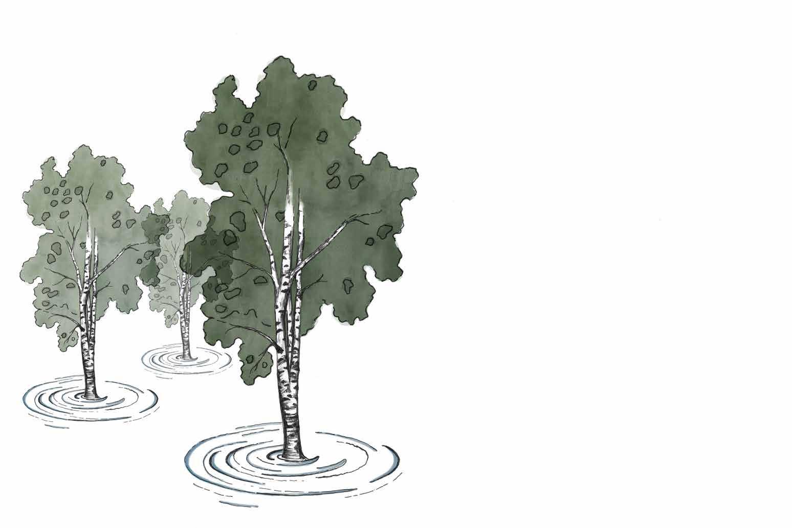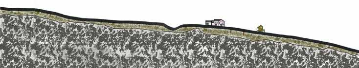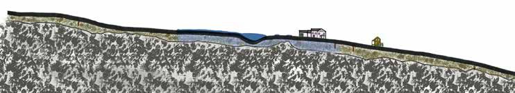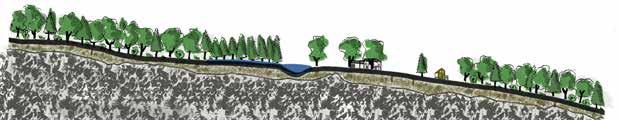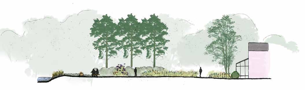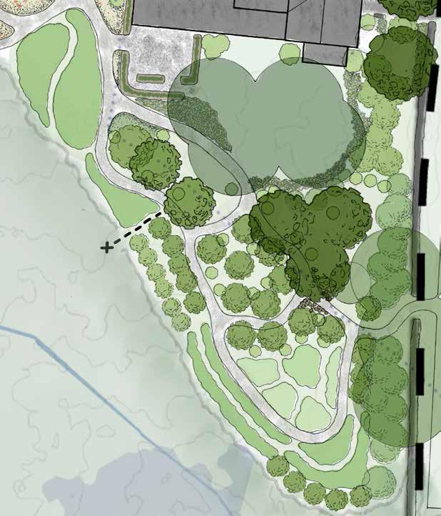 This immersive program and gathering space highlights the wet nature of this spot, allowing it to flourish as a wet meadow for program use by building an elevated platform on piered footings. up through the base. Areas directly under the platform are planted with low growing groundcover. Three pools are set within the platform, serving as somatic exercise space and cold plunges for the sauna which is located just to the north. eastern edge of the platform. Two small patios at the top of the retaining walls overlook the platform area. The western patio, under the birches, and the amphitheater are aligned so that a live event or musical performance could be staged on the patio and viewed from the platform area below.