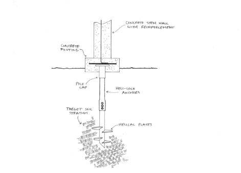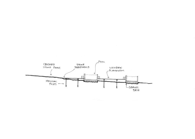 Cross section of the transition from path to aquatheater platform. Depth of gravel base and helical piles will depend on conditions of the soil and substrate and weight of the structure
