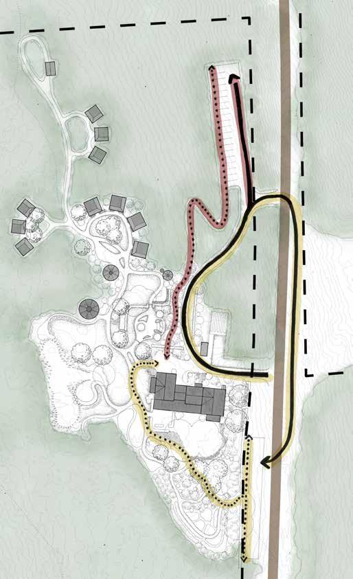Upon arrival, vehicles pull into the main driveway and are greeted in their vehicles by Relational Uprising staff at the welcome patio, where they can drop their luggage and receive directions before continuing north down the old barn road. In phase one of the design (shown in yellow above), cars park in the right-of-way on the west side of Fred Snow Road before starting their journey back to the welcome patio. The path takes visitors on an enchanting walk through the food forest, along the south side of the sugar maple lawn and the outdoor dining patio, then around the west side of the house before arriving back at the welcome patio. In phase two (in red), instead turning back onto Fred Snow Road after pulling through the driveway loop, vehicles will continue into the parking lot on the north side of the property From there, they will take a short walk through the woods and along the east side of the aquatheater before arriving back at the welcome patio for refreshments. ADA parking is located to the east of the dining structure and adjacent to the welcome patio, with the flattest and shortest journey to the main program areas.