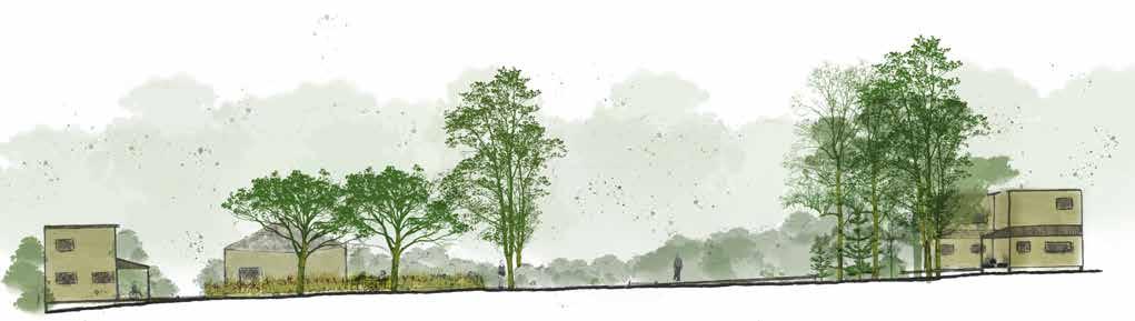 Accommodations for workshop participants take the form of tiny houses, clustered in three groups. Each tiny house has three bedrooms and a bathroom with composting toilets and a sink . Water is supplied through rainwater capture from the roof. A group of four tiny houses is arranged in a semi circle at the northern edge of the cleared area. These tiny houses are fully accessible with the bathroom and one downstairs bathroom meeting ADA requirements. The porches of these four tiny houses overlook a meadow and fruit trees in the courtyard of the buildings. This group is also located closest to the shared shower house. Slightly farther back in the woods is a second group of tiny houses. These three buildings are sited within the wetland buffer in a dry area where a stand of beech trees is dying out. Due to the sensitive nature of this area, these tiny houses are built on piered footings to minimize disturbance and are accessed by a raised boardwalk path. Trees planted in cutouts in the boardwalk provide a place to hang hammocks, giving this cluster of tiny houses an elevated treehouse feeling. The final group of tiny houses is located farther to the north and is nestled into the woods. These three tiny houses would also be constructed on piered footings to minimize disturbance. Electric lines will need to be run to all of the tiny houses.