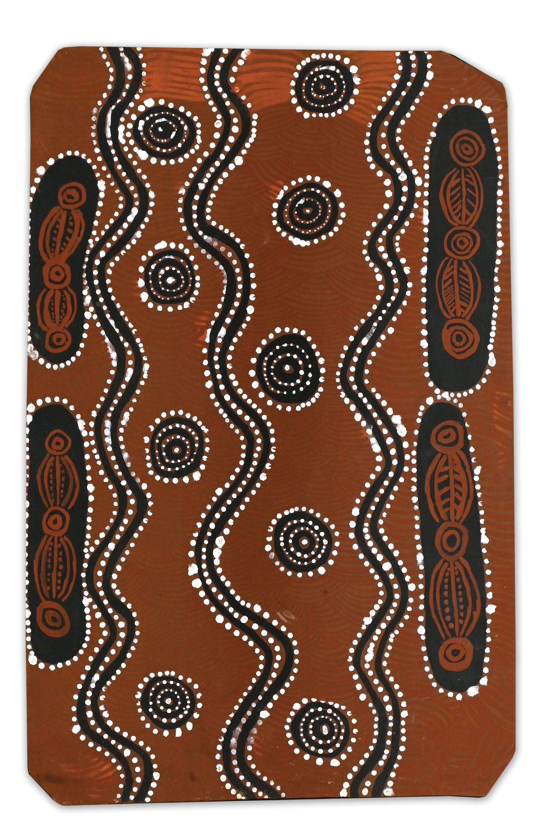 Painted in 1973 this painting uses black traveling lines to depict a snake merging into its own tail and concentric circles representing the sacred sites women visited along the the journey to catch the snake. These visual symbols connect the land, the people, and their Dreaming stories. The work was exhibited in what was considered to be the first exhibition of Indigenous fine art in regional NSW when it was exhibited in Aboriginal Art from Papunya at The Anvil Gallery in Albury, NSW, in 1974.