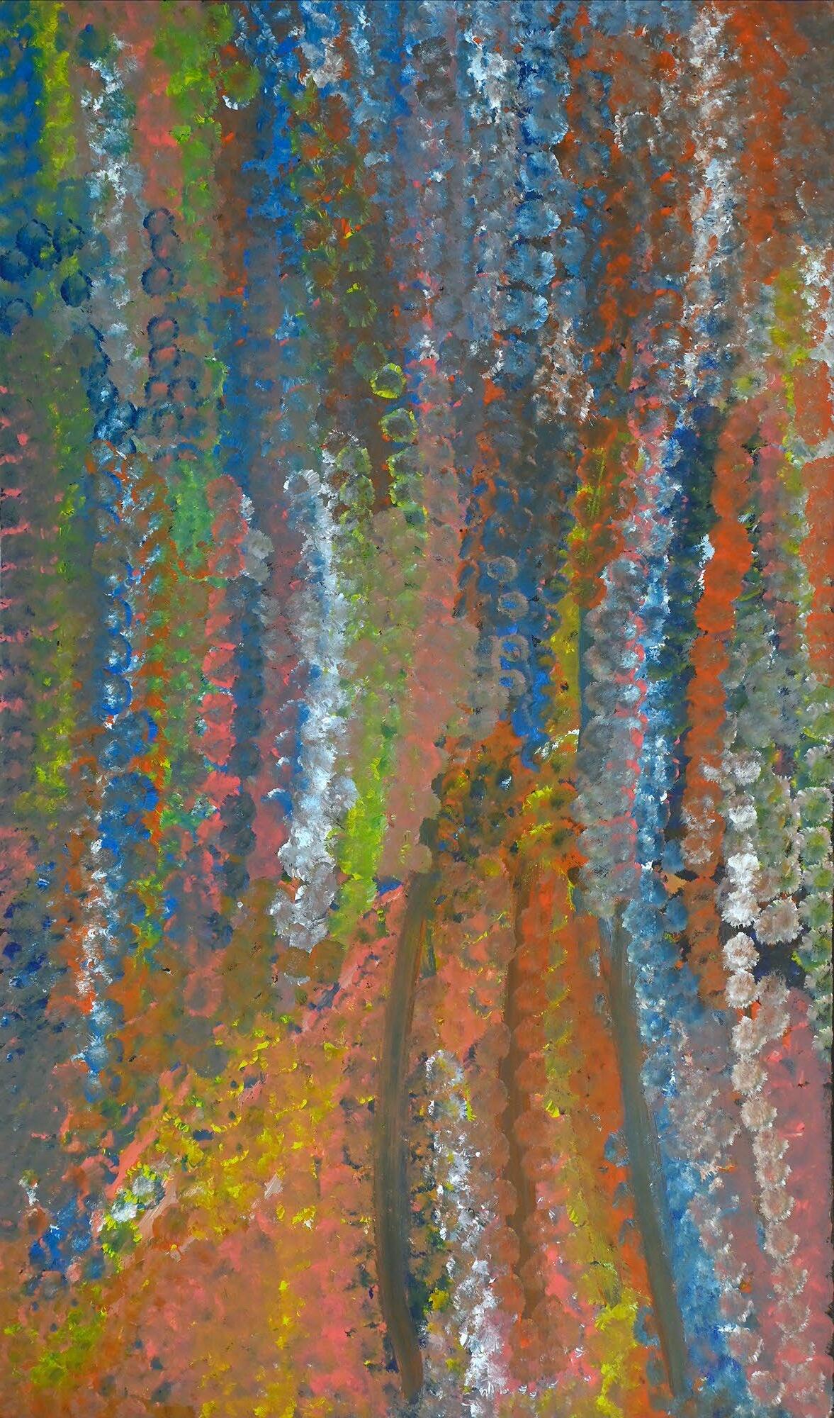 This work evokes the flourish of growth that is exceptional and rapid. The dramatic transformation of the desert from bare to abundant is a display of the desert’s power. Linked into this is women’s ceremonial life called ‘awelye’ that is based on the belief that they help nurture the desert food sources by assuring future fertile generations.