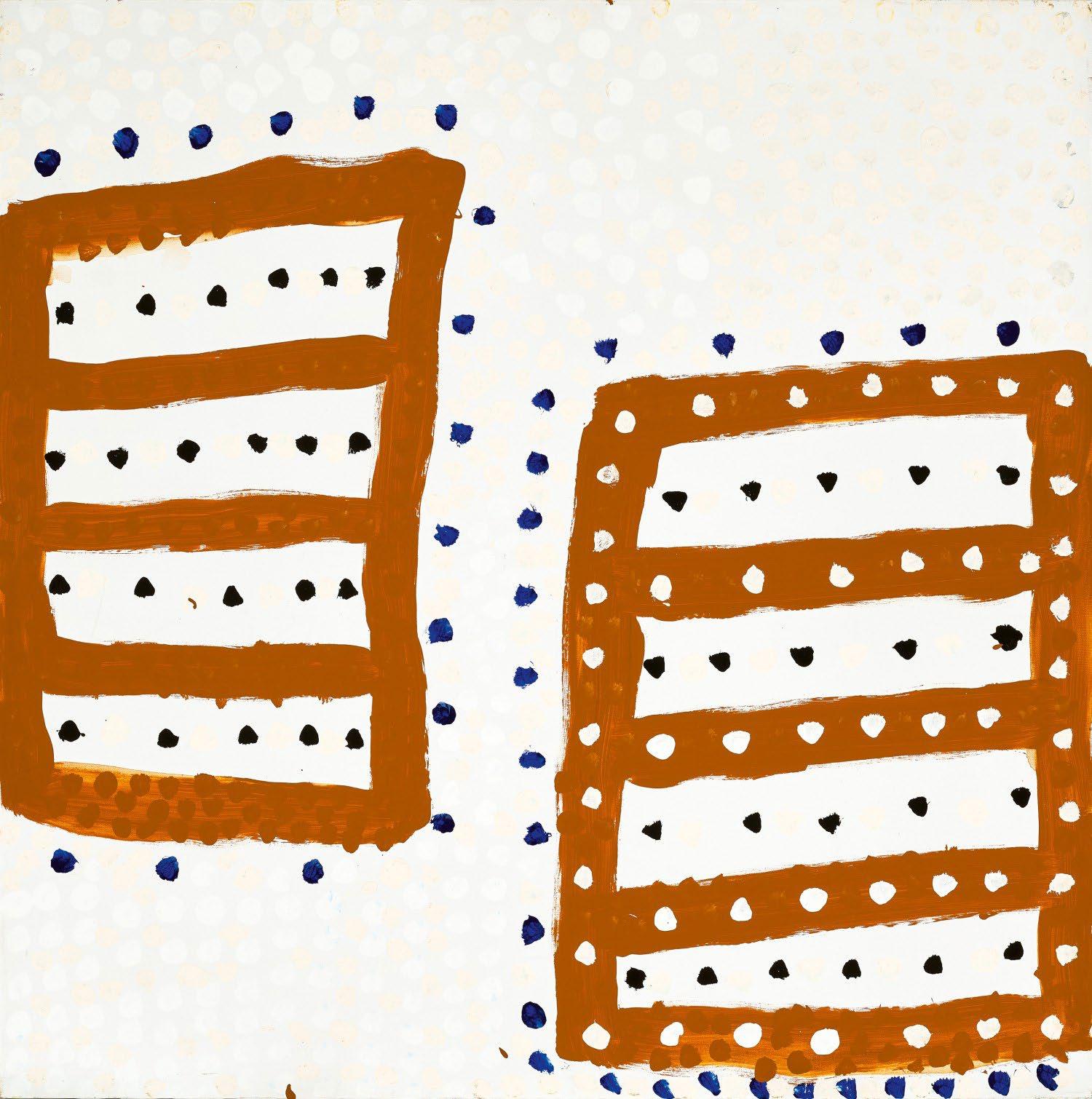 The painting Body Marks (1998) exemplifies this commitment to ensuring ceremonial knowledge would endure in painted form. Created on his characteristic white ground, the work depicts a tan rectangular design surrounded by fields of alternating coloured dots. Within the central motif, rhythmic blue-black markings are punctuated with subtle tan and white accents, producing a vibrant sense of movement and intensity. These patterns replicate the body painting that he once applied to men before performance, but here they are transformed into a lasting visual record.