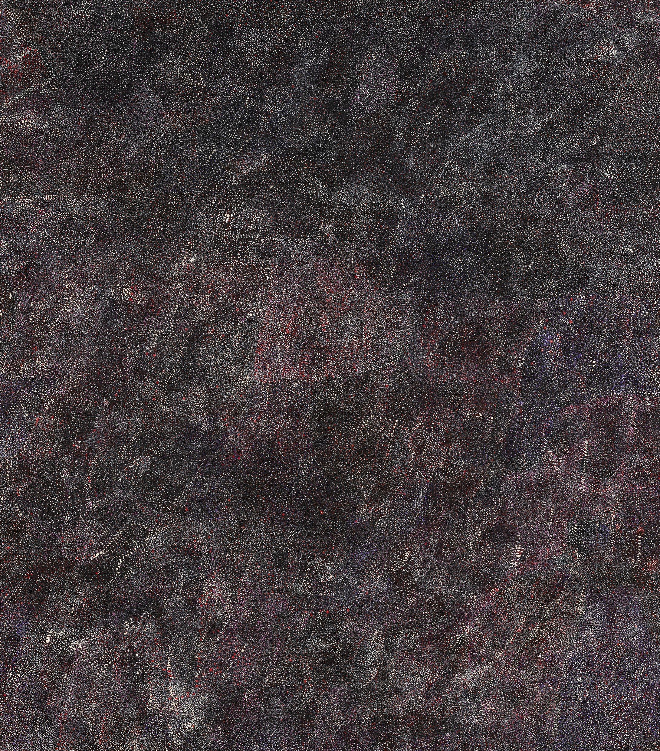 Layer upon layer of fine dotting subtly reveals the underlying structure below. Earthy pinks and ochres form undulating, shifting fields. Touches of red and yellow ochre, and highlights of black