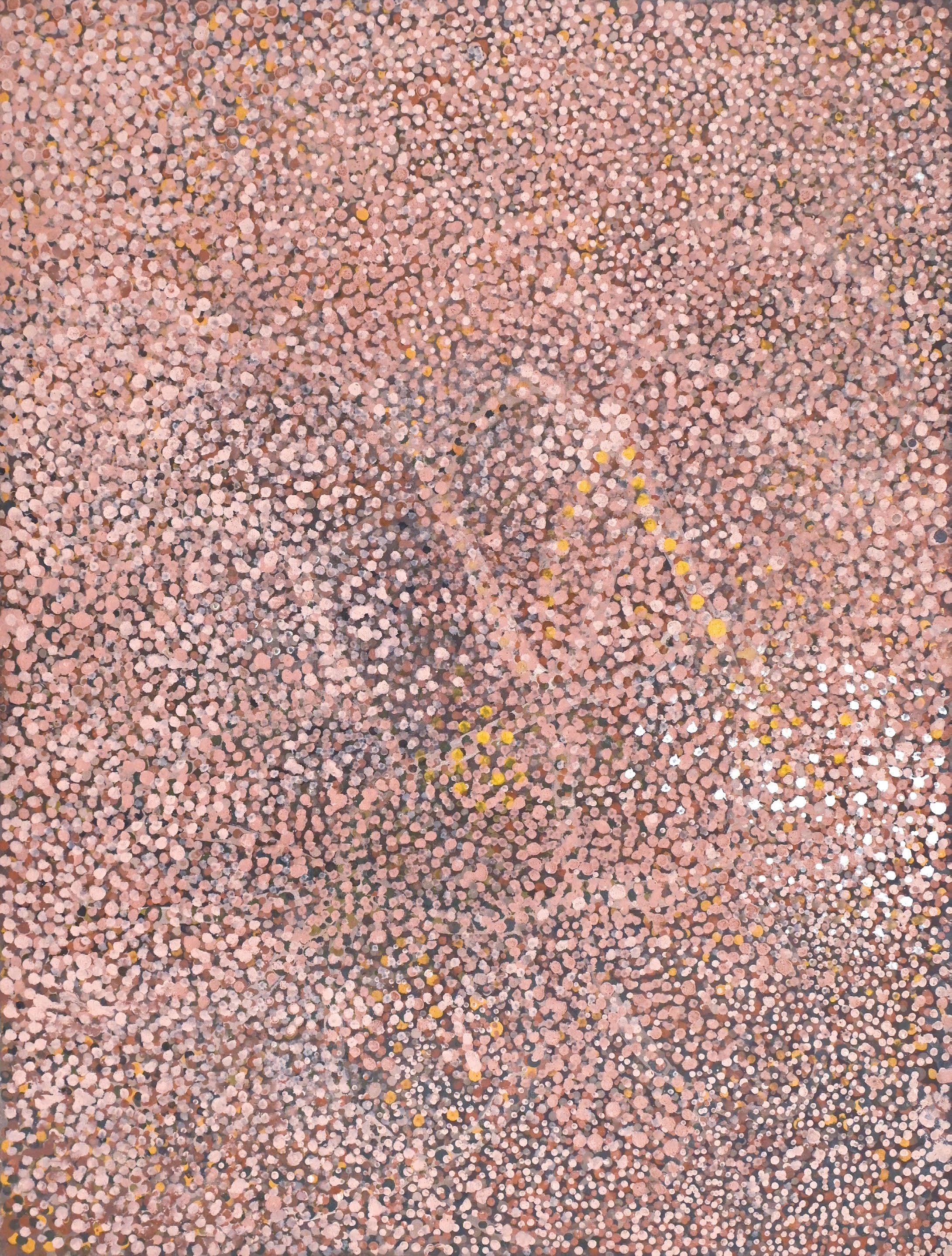 In this work, painted in December 1993, the application of yellow and green highlights the varied and changing hues in the life cycle of the Anooralya Yam and other food plants found near Alalgura on Utopia Station, west of Delmore Downs. Viewed from an aerial perspective, the painting reveals the sporadic, clustered growth that emerges following summer rain. The flourish of new life that follows is both exceptional and rapid.