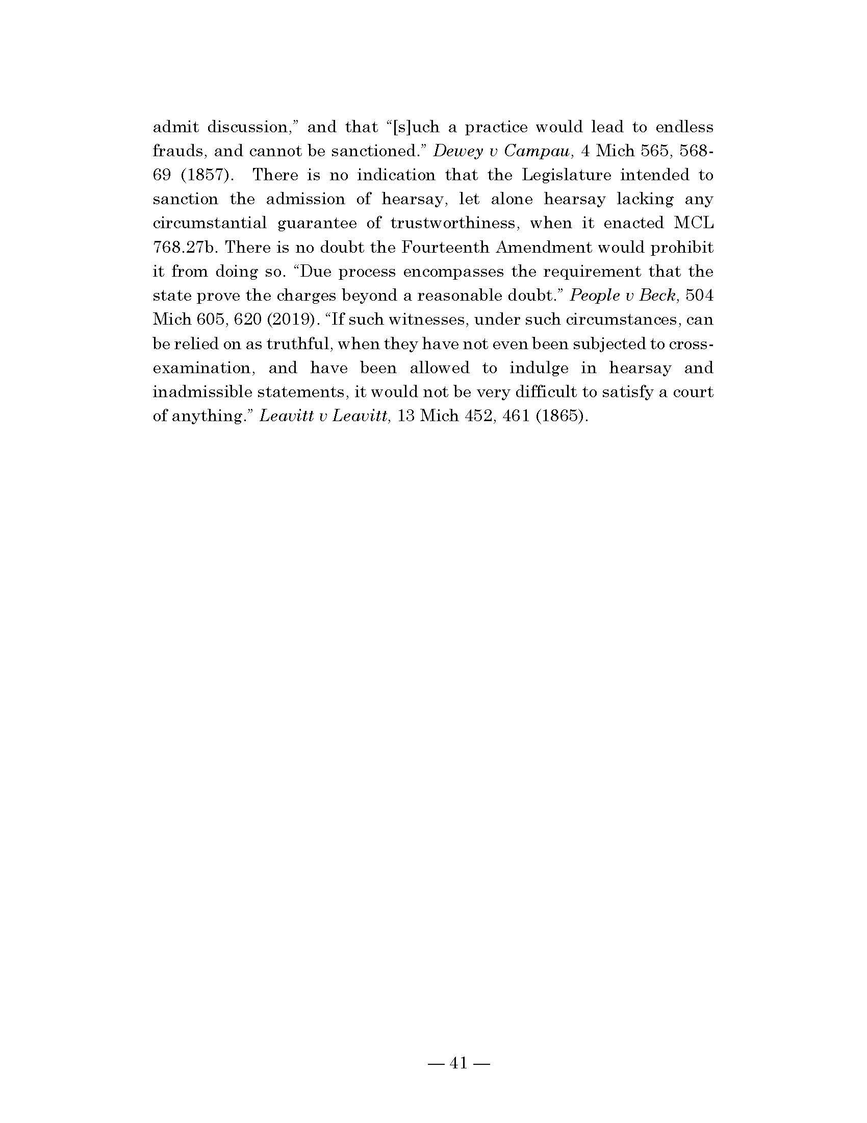 With regard to the evidence of other acts of domestic violence, Defendant argued that the Court of Appeals erred in its interpretation of MCL 768.27b because MCL 768.27b does not limit or preclude the consideration of MRE 802, which states that hearsay is generally not admissible. The Michigan Supreme Court agreed and reversed and remanded the Court of Appeals’ holding on this issue.