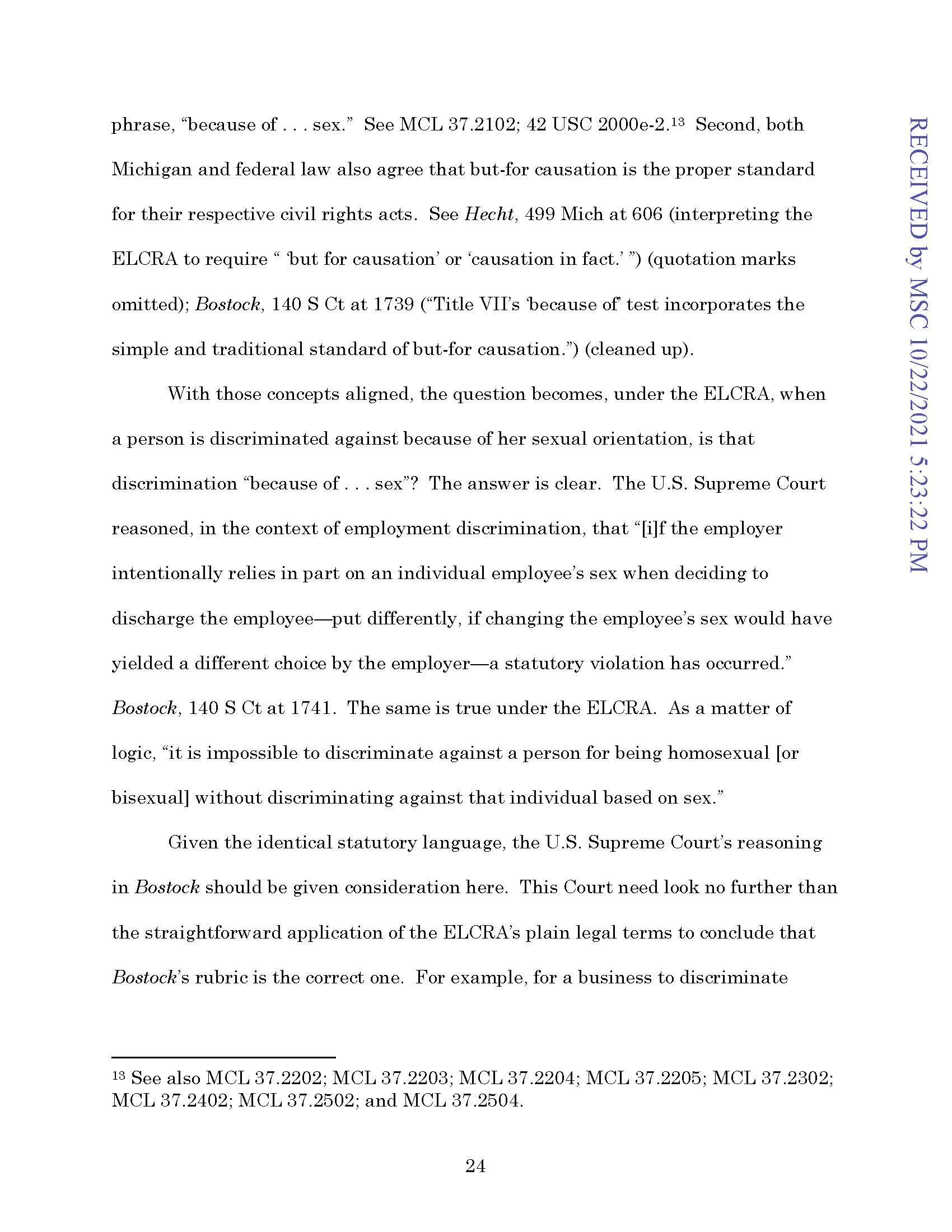 The brief also addressed the issue of whether the MDCR had properly opened its investigation into the plaintiffs’ violations of the ELCRA, arguing that the plaintiffs’ alleged violations of the ELCRA necessitated an investigation because they denied individuals the “full and equal enjoyment” of services and that “sex played a necessary and undisguisable role” in the decisions to do so.