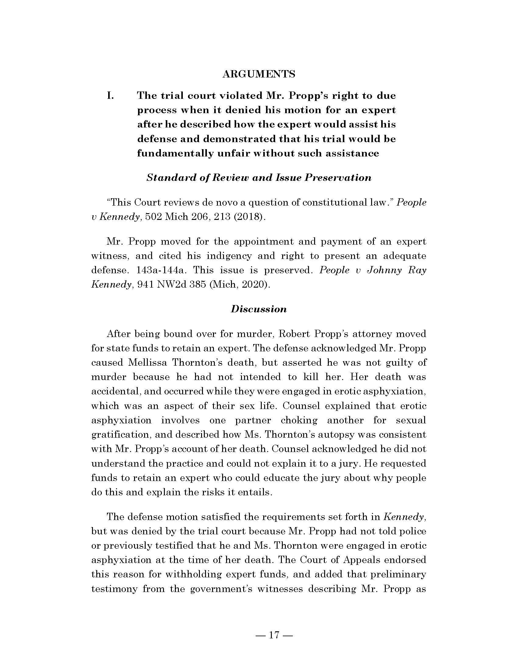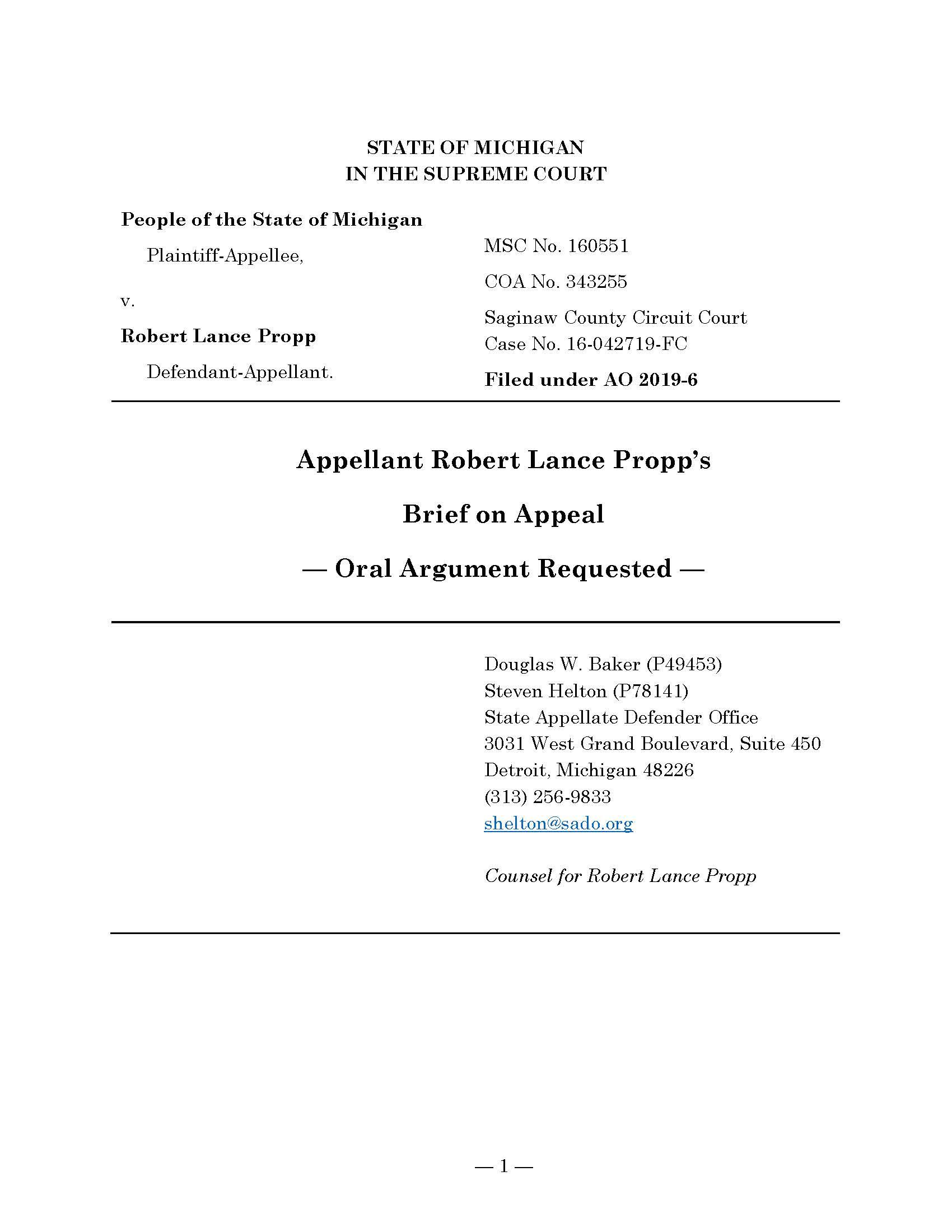 After the Court of Appeals affirmed his conviction, Defendant was granted leave to appeal to the Michigan Supreme Court to address: (1) whether the Court of Appeals correctly affirmed the trial court's decision to deny the Defendant's motion for expert funding; and (2) whether the Court of Appeals correctly held that evidence of other acts of domestic violence is admissible regardless of whether it might be otherwise inadmissible under the hearsay rules of evidence. Defendant argued that the Court of Appeals erred in characterizing Mr. Propp’s defense as an affirmative defense, thus rendering the basis for its ruling inapplicable. The defense of accident was not an affirmative defense because defendant did not bear the burden of negating intent. Therefore, the Court of Appeals failed to apply the correct standard, and the Michigan Supreme Court vacated the Court of Appeals’ analysis on this issue.