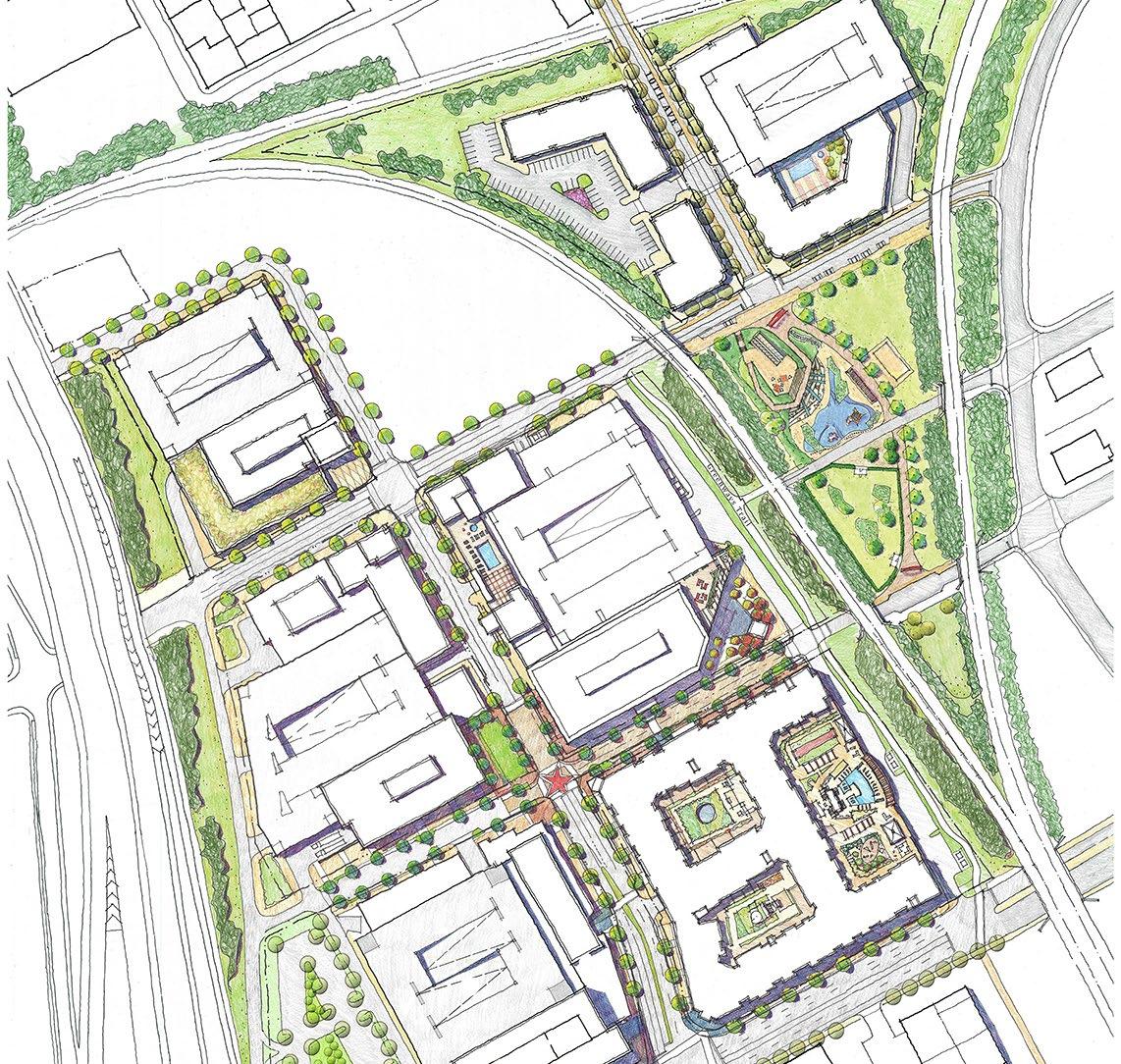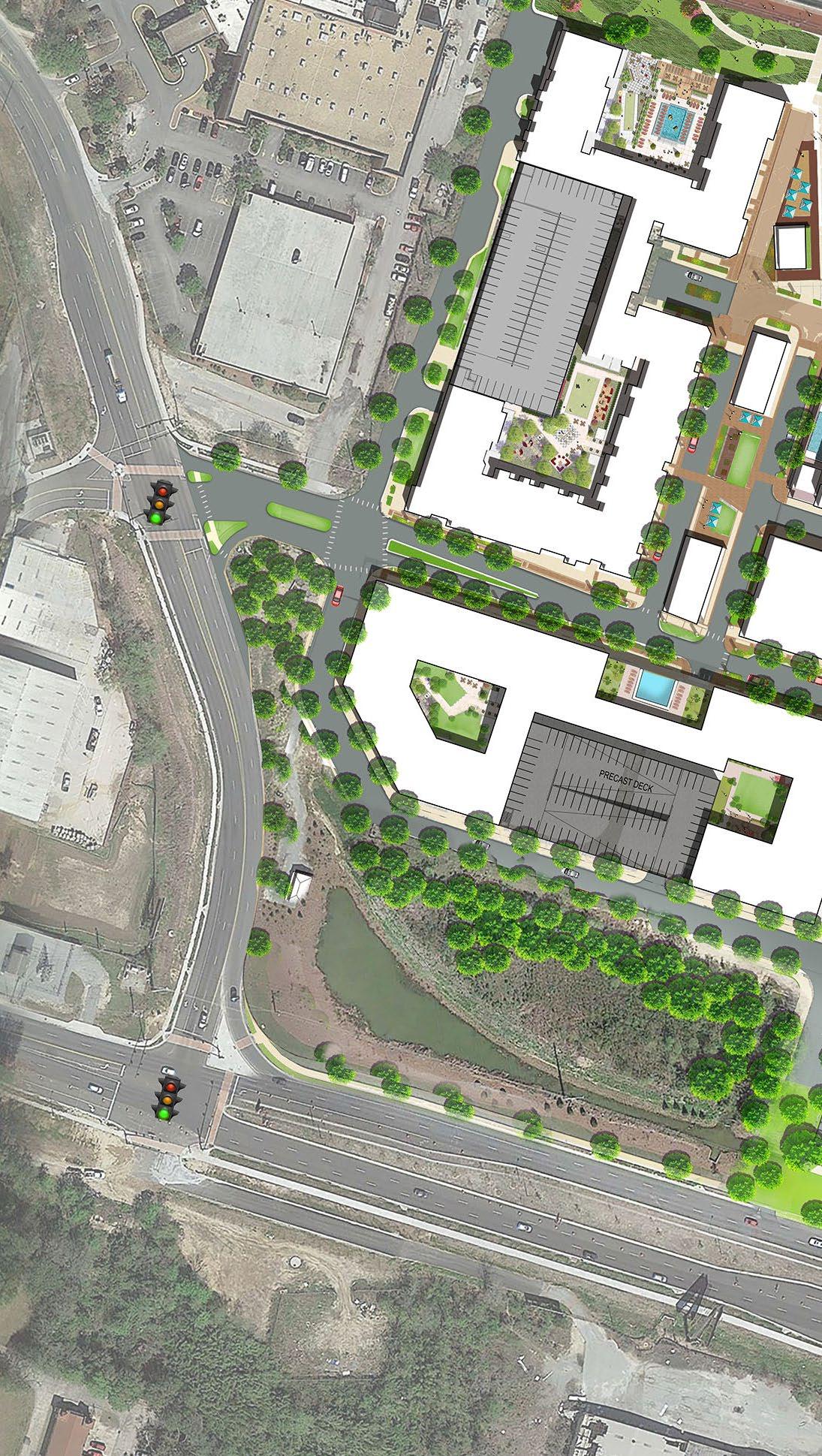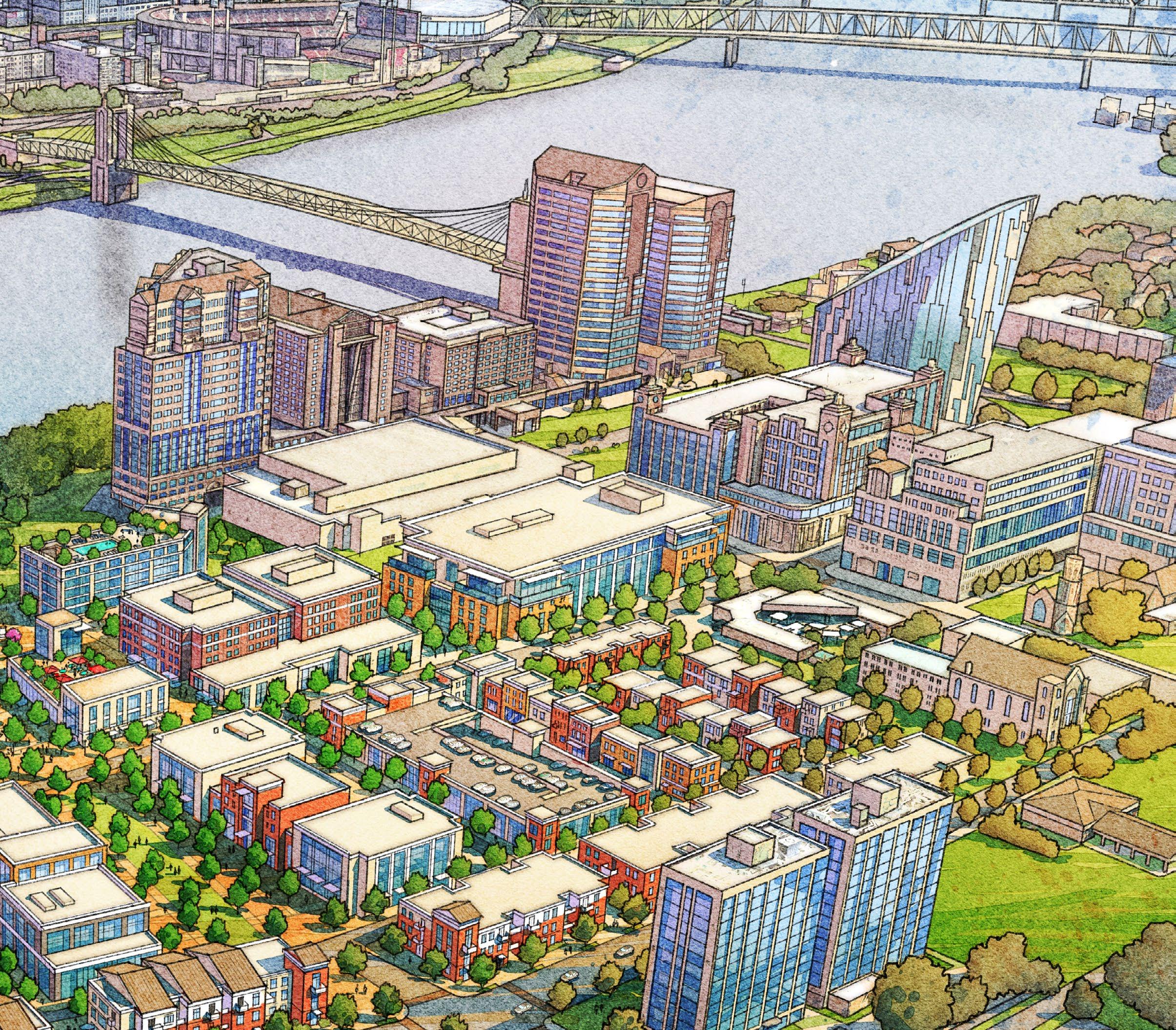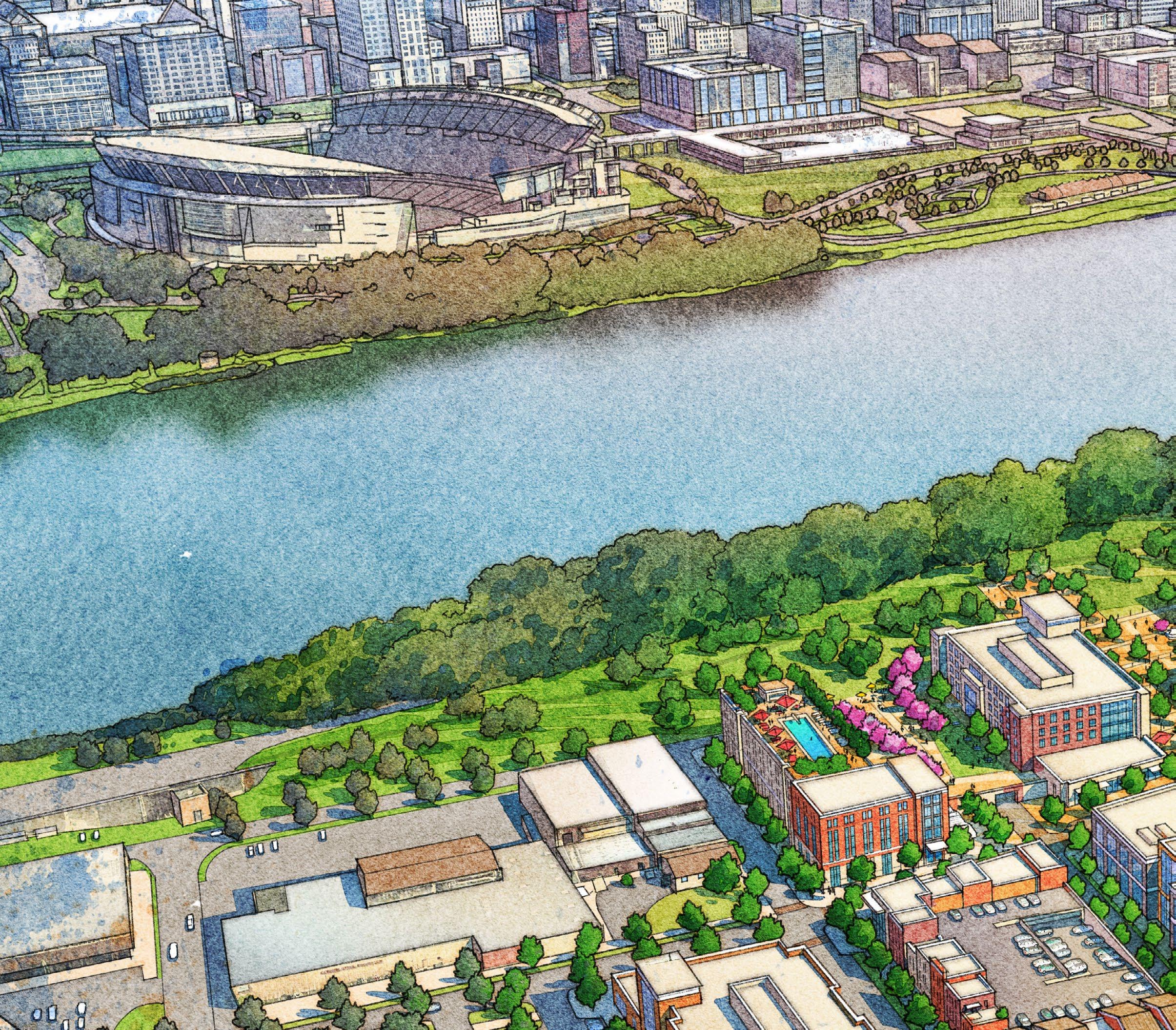 Our work established a comprehensive urban vision supported by a master plan and design guidelines that integrate office, residential, retail, hotel, and open space into a cohesive, walkable framework. A connected street grid—anchored by a lively main street and festival corridor— creates a clear structure for development while linking directly to the Nashville Greenways and the city’s expanding trail system.