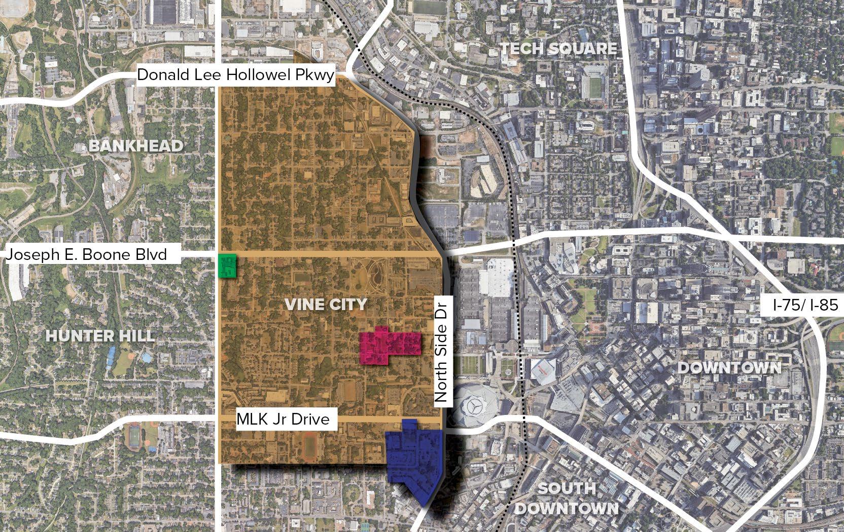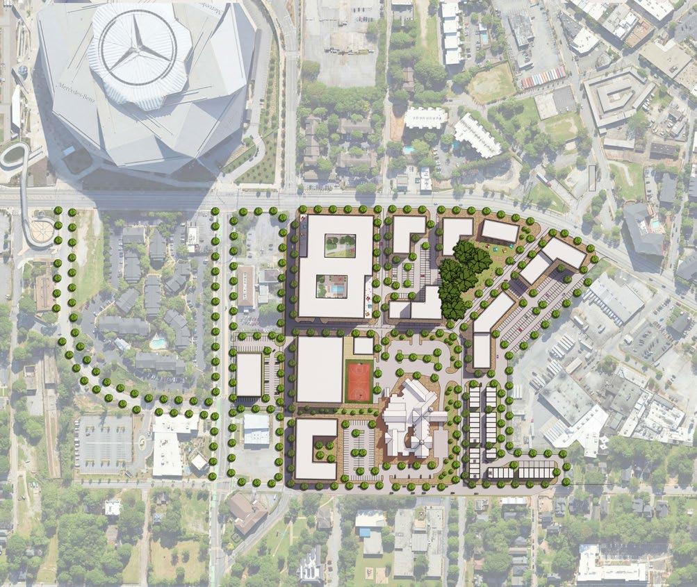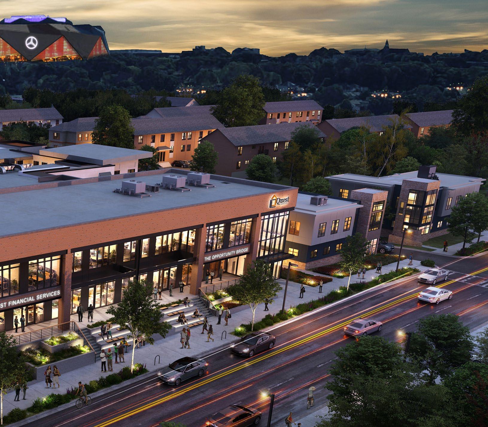 A mixed-use village near Mercedes-Benz Stadium bringing together affordable, senior, and student housing with medical office, retail, and wellness uses. The design prioritizes walkability, open space, and community gathering, reinforcing connections between faith, neighborhood, and daily life.