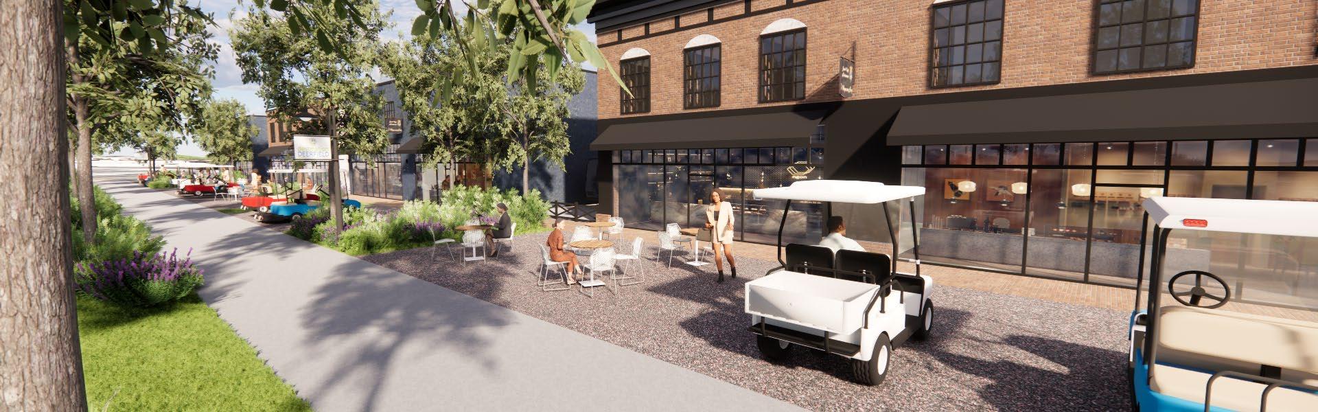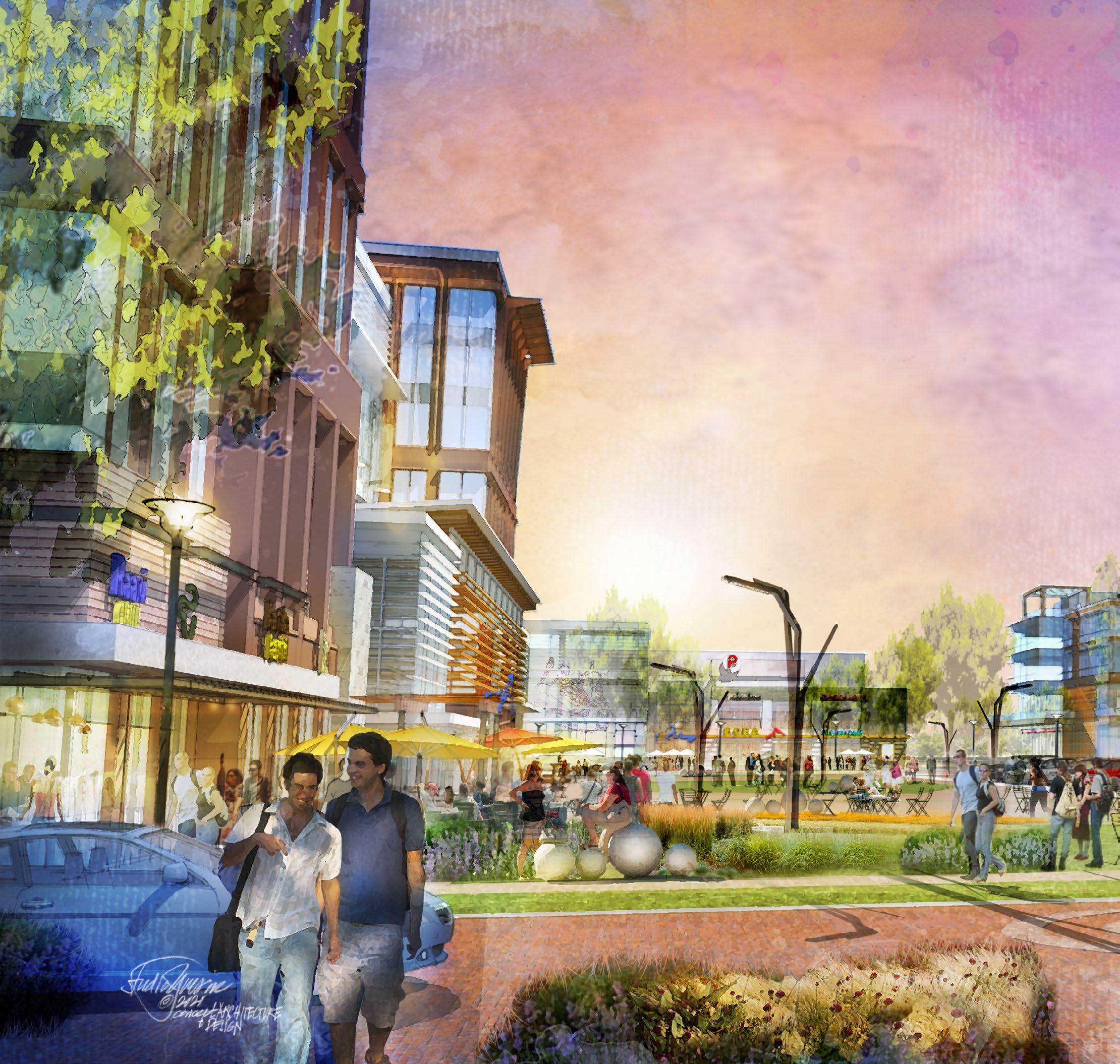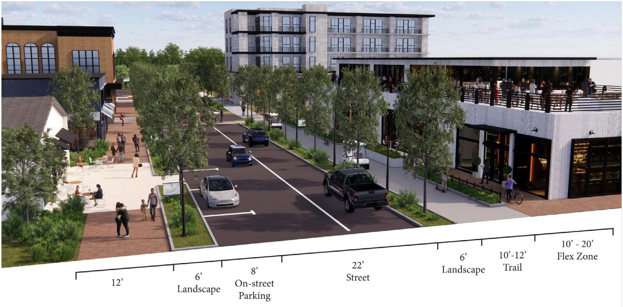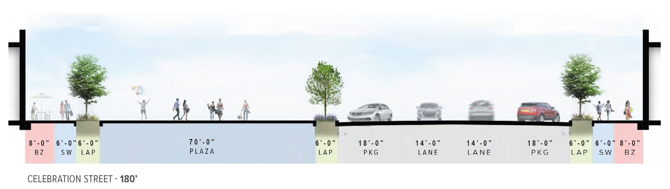 Wide, tree-lined streets, connected trails, structured parking, and Celebration Park form the backbone of the plan, supporting a mix of residential, office, retail, hospitality, and civic uses. Anchored by dining, entertainment, and an ice complex, the district blends active public spaces with a cohesive, human-scaled environment. The framework aligns placemaking, branding, and development structure— supporting phased implementation while maintaining a strong, recognizable identity as the district evolves.