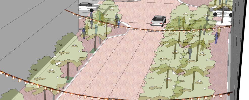 Nelson Merry Street is the ‘Fes val Street’ of the Capitol View. Buildings shall address the street with ac ve uses at ground level; par cularly 1/2 block east and west from the 11th Avenue intersec on. Servicing of buildings is discouraged in this zone. Specialty paving and a cohesive paving pa ern is encouraged along this street and within adjacent public plaza to help unify the ground plane. An 8’ clear zone for pedestrians must be maintained along the en re corridor. Parallel parking is required where possible but should not be allowed during special events. Fes val ligh ng across the street adds ambiance to the street and must be high enough to allow emergency vehicles to move through. The far east and west ends of the street will be designed with a more typical street and sidewalk treatment.