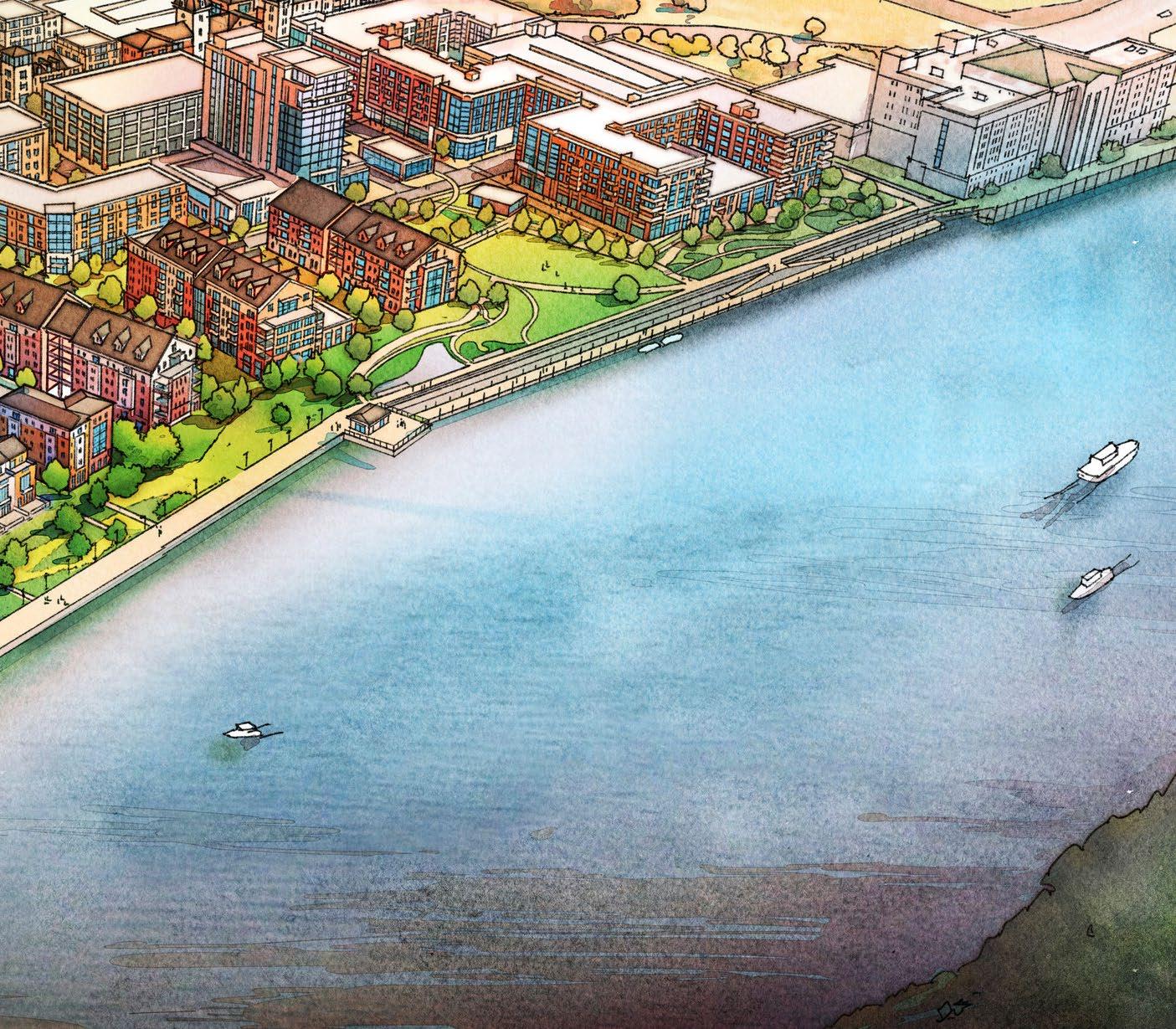 A strategic master plan repositioning a 21-acre former IRS processing facility into a mixed-use riverfront district reconnecting downtown Covington to the Ohio River. Delivered to the City and the U.S. General Services Administration (GSA), the framework established land use, zoning, and phased implementation strategies to support conveyance and public-private redevelopment.