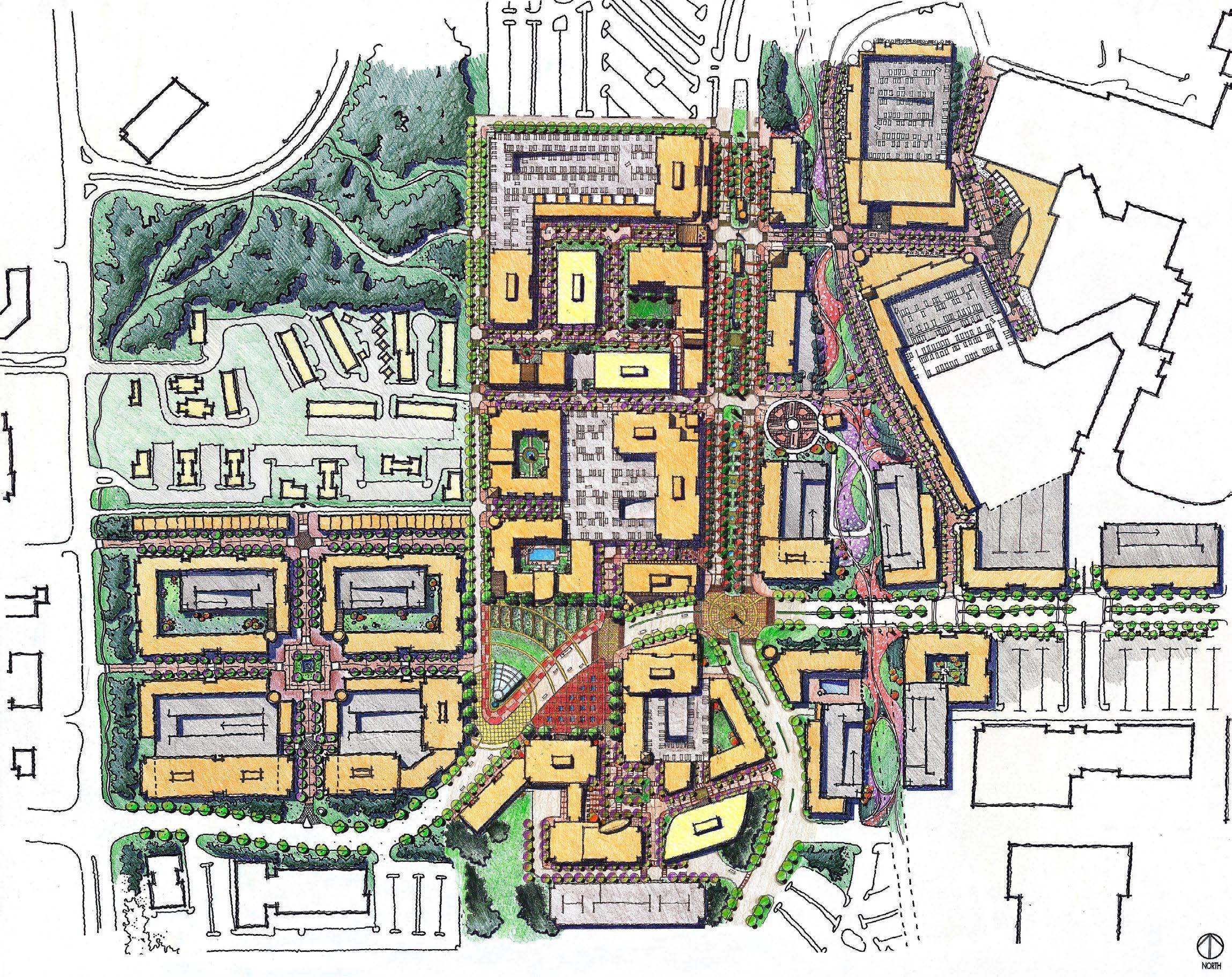 The Springline vision establishes a structured yet flexible framework that organizes growth around distinct districts—a mixed-use core, residential neighborhoods, a commercial node, and health/hospitality focused destinations—each connected through a public realm.