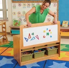 This Early Years Creator Center features portrait and landscape orientations, with a magnetic double-sided board and a lower compartment for storage of numbers, letters, and more for children to access on both sides.