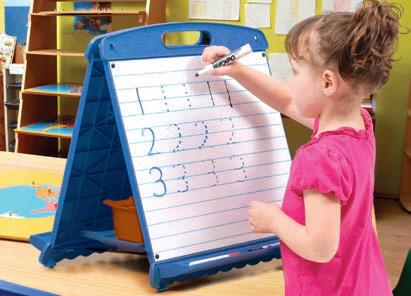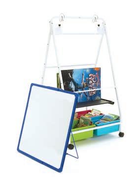 This handy easel is lightweight, has a comfortable shoulder strap for hands-free carrying, a marker pocket and a kickstand to set it up at an angle. It can sit on the ground, picnic tables or be used anywhere in a school and can also be hung by attaching the strap to the hooks (hangs portrait or landscape). Store inside.