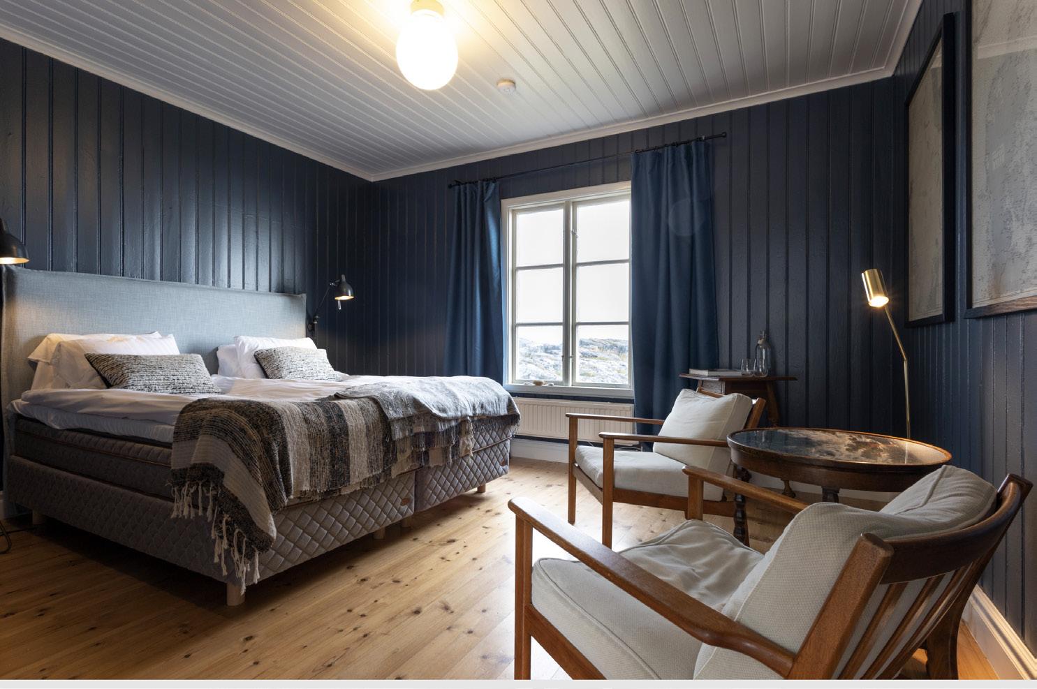 Vi tas emot som dignitärer och samtidigt som gamla kompisar av hela personalen och de delägare som driver Pater Noster tillsammans. Vi är de enda gästerna och har hela ön för oss själva. Här finns arton bäddar i nio varsamt utformade hotellrum alla med sin egen karaktär. I den gamla fyrvaktarbostadens officiella delar har man inrett ett trevligt vardagsrum och en vacker matsal. Allt med stilsäker hand och varsamt bevarande av husets egensinniga själ.