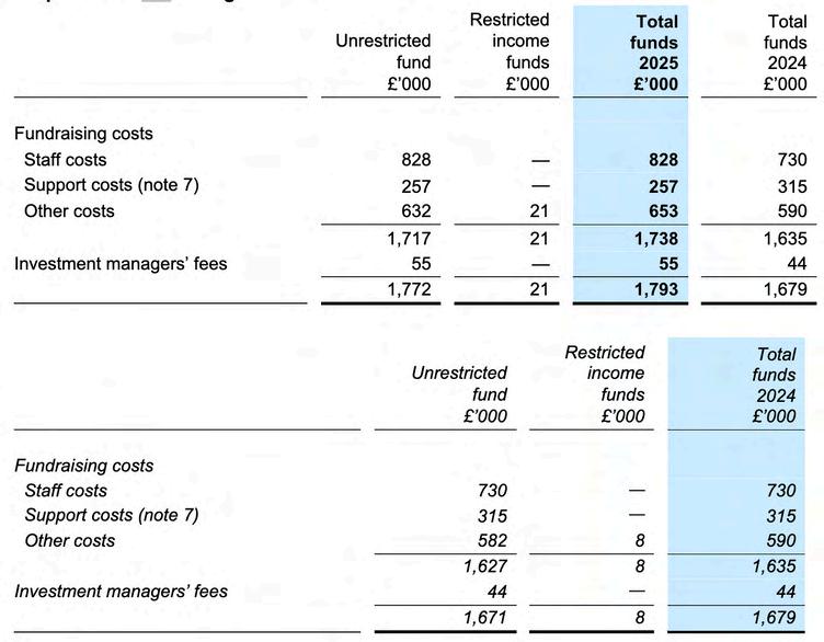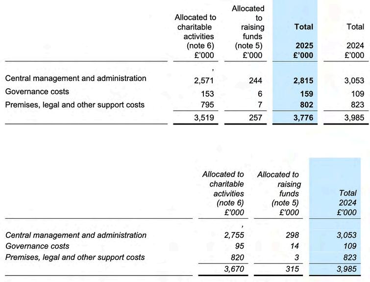 Central management and administration costs are the support costs which enable fundraising and charitable work to be carried out. These costs include the relevant proportion of central finance, human resources,informationsystemsandcommunications,andsimilarfunctionsthatsupportfrontlineservices.