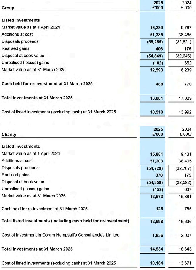All listed investments are listed on a UK stock exchange except for £265k (2024 - £534k) invested in the Schroder Private Equity Fund of Funds programme which is managed by Schroder Investment Management Limited and Aberdeen SVG Limited. The funds are listed on the Irish Stock Exchange and invested in a portfolioofprivateequityfundsmainlyintheUSandEurope.