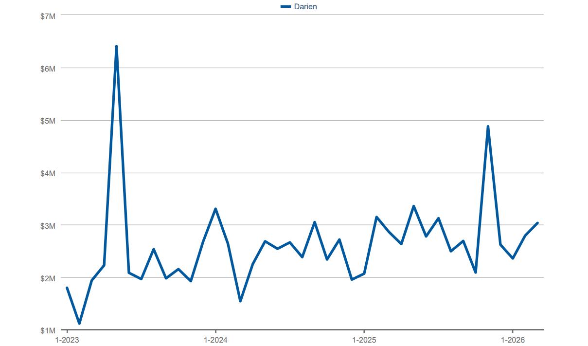 Darien’s single-family market saw a notable shift in March, with a meaningful increase in new supply. A total of 36 homes came to market, down 16.1% YoY but more than doubling from February, providing some long-awaited relief for buyers. Inventory held steady at 22 homes for sale, unchanged from the prior month though still below last year’s levels. Momentum picked up on the demand side, with 33 pending sales, up 26.9% YoY and 230% from February, pointing to strong absorption of new inventory. Closed sales also rose to 10 transactions, marking a sharp increase from the previous month. There was just 1.3 months supply of inventory at the close of the month.