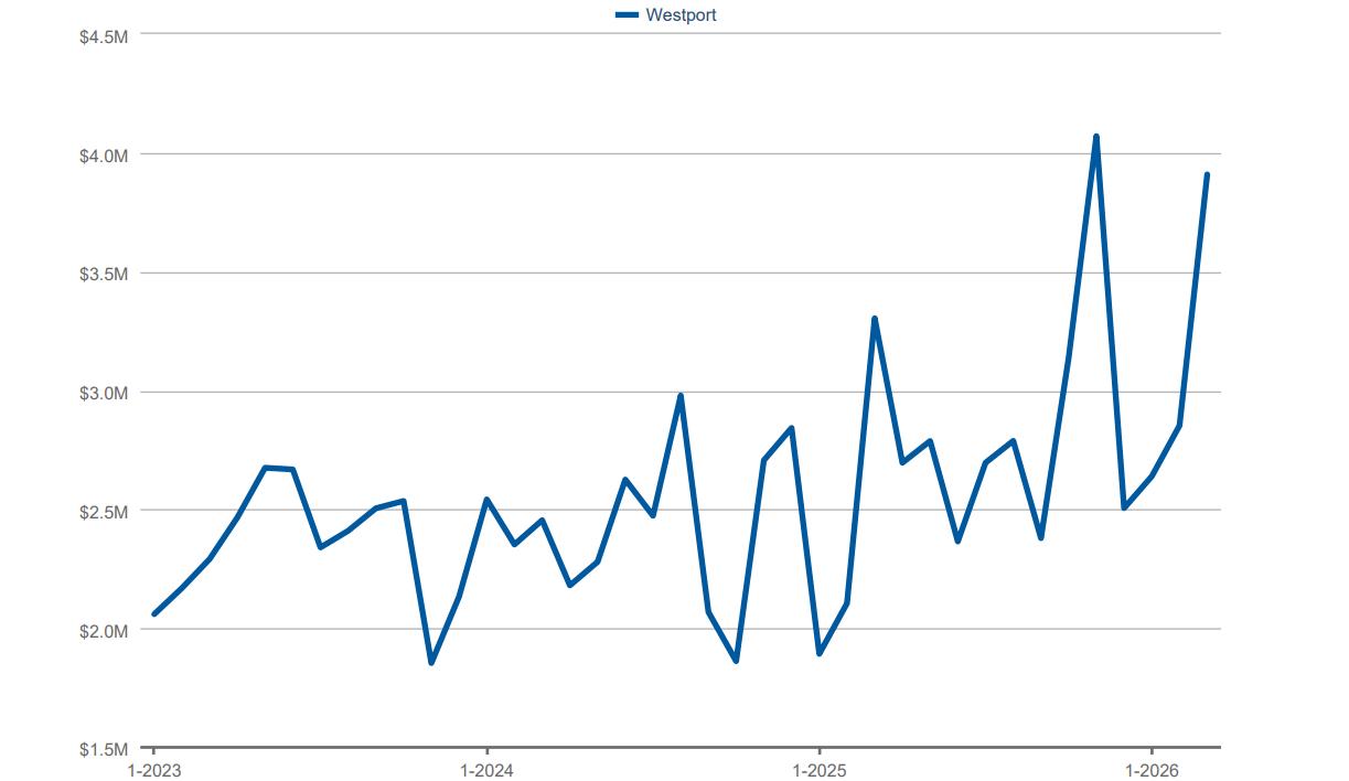 Westport’s single-family market saw an increase in activity as more inventory came online. New listings totaled 35, down 22.2% YoY but up 75% from the prior month, while inventory edged up to 58 homes for sale, a slight 1.8% increase from last month though still 25.6% below last year. Buyer activity remained steady, with 28 pending sales, up 7.7% YoY and 47.4% from February, as homes continued to trade despite limited supply. Days on market increased slightly but remained relatively low at 33 days. Pricing strengthened at the upper end, with the average sale price rising to $3.9M, up 18.3% YoY. With 2.3 months of supply, Westport remains an inventory-constrained market.