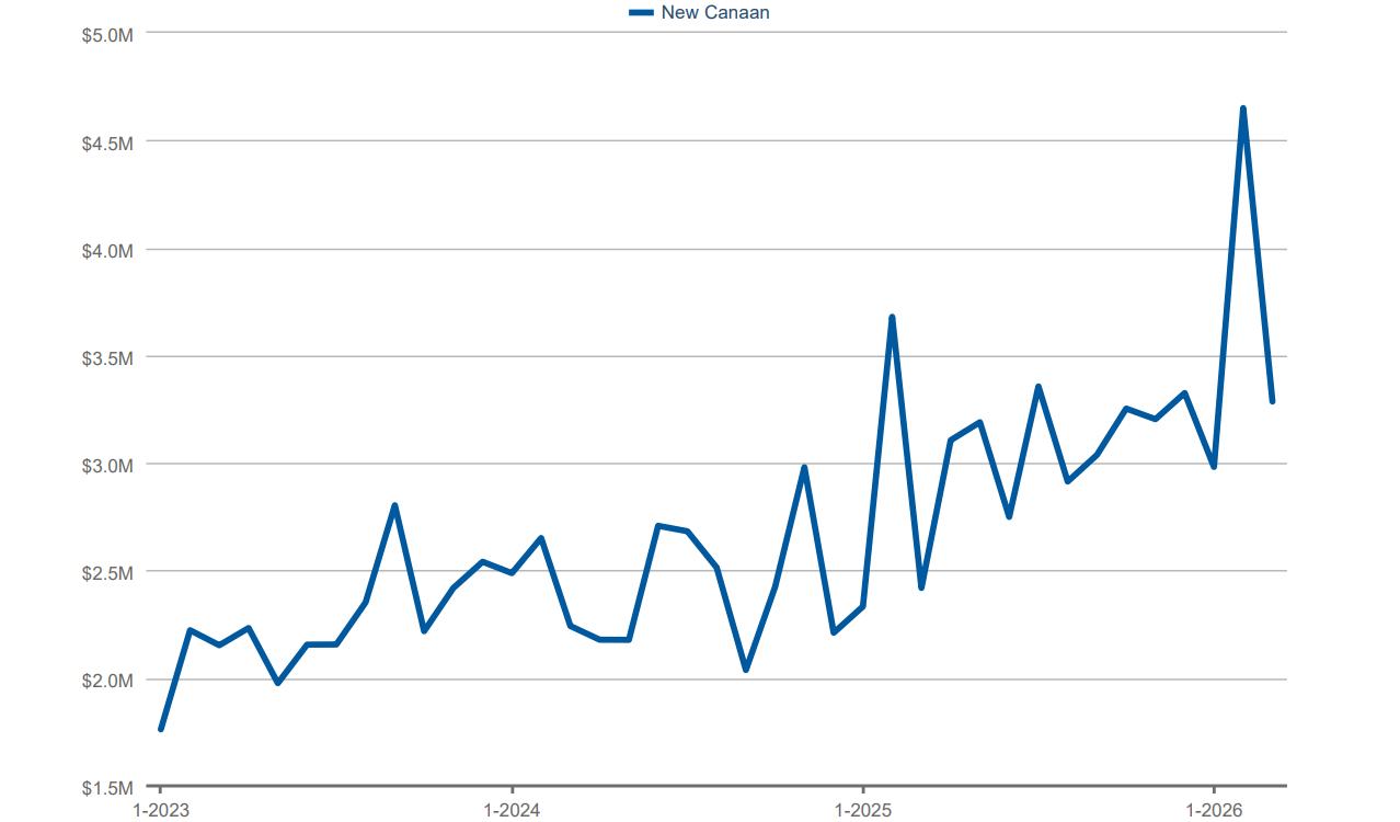 New Canaan’s single-family market continues to face tight inventory conditions, with just 1.5 months of supply at month end. New listings totaled 15, down 40% YoY and slightly off from February, while inventory contracted further to just 26 homes for sale, down 39.5% YoY and 29.7% from the prior month. Despite limited supply, demand accelerated. Pending sales rose to 24 transactions, up 33.3% YoY and 140% from last month, signaling strong buyer engagement as opportunities come to market. Closed sales followed, totaling 17 transactions, up 70% YoY and 325% from the prior period. The median sale price reached $2.66M, up from last year but down from the previous month, reflecting variability in pricing.
