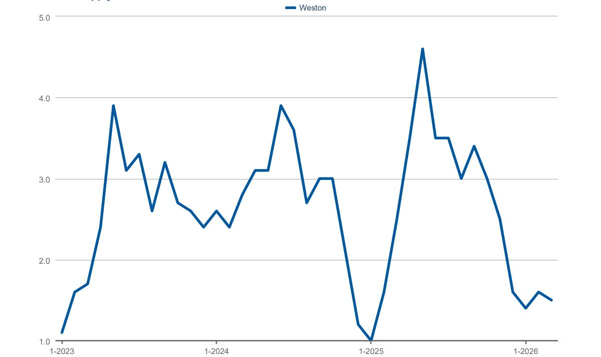 Weston’s single-family market showed a pickup in activity, though supply remains tight. New listings totaled 11, down 47.6% YoY but up 57.1% from February. There were 16 homes for sale, down 44.8% YoY and 5.9% from the prior month, continuing to limit buyer options. Buyer activity strengthened notably, with 9 pending sales, up 12.5% YoY and 200% from February. Closed sales remained limited with 4 transactions during the month. The median sale price declined to $750K, down 46.4% YoY and 37.5% from February, reflecting a shift in the mix of homes sold. With just 1.5 months of supply, Weston remains a constrained, inventory-driven market.