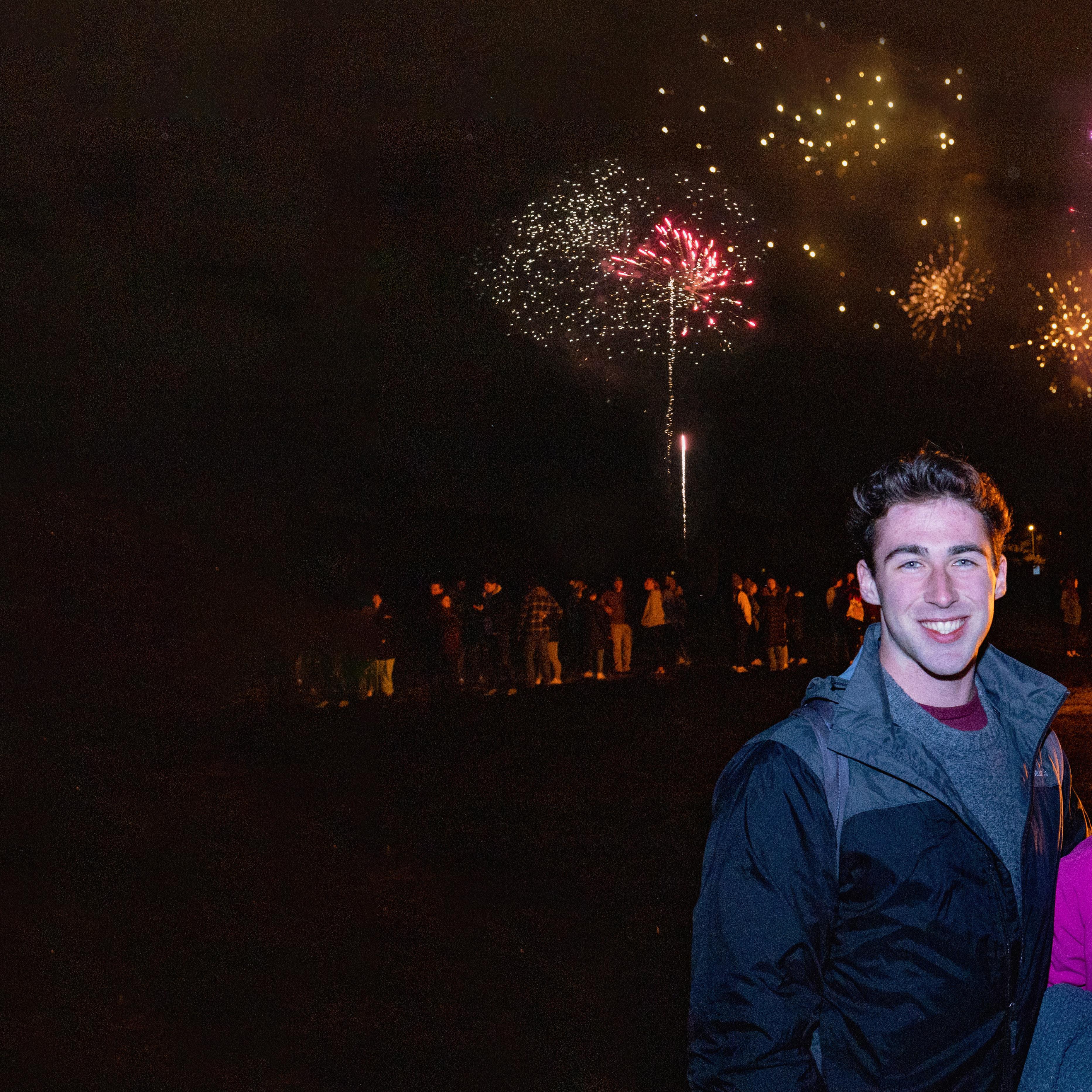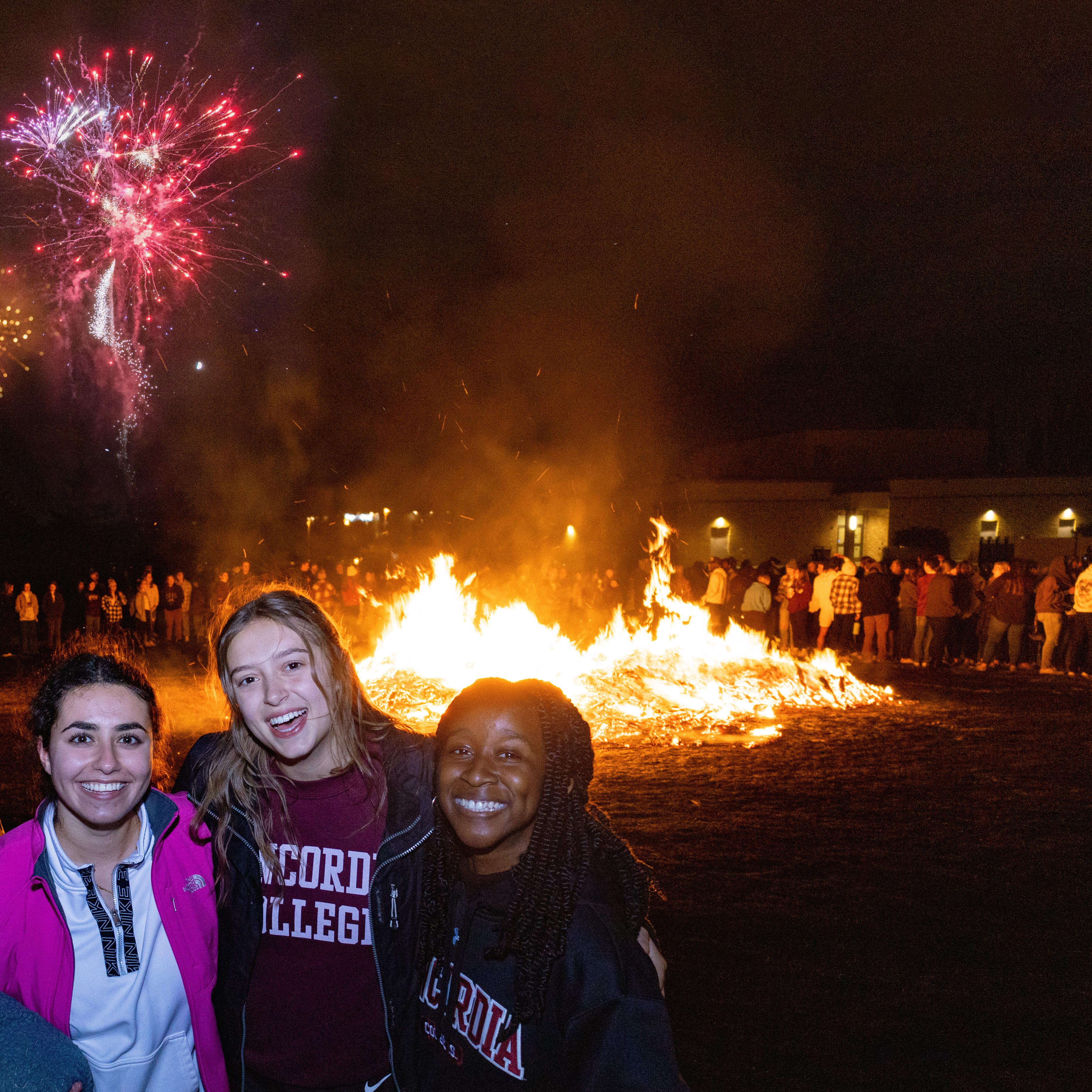 Students kick off Homecoming weekend with an annual bonfire built like no other (aka HUGE). The night ends with a fireworks display over Jake Christiansen Stadium.