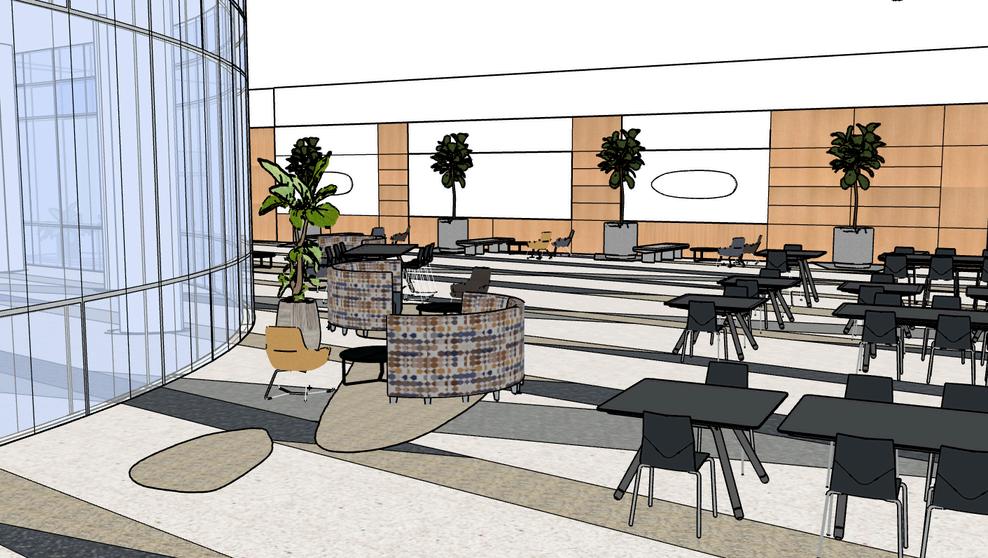 Rooted in the university’s mission to support equity, respect, and inclusion, the design embraces bold, expressive colors, abstract art, and biophilic elements to reflect the richness of diverse cultural identities. Strategically divided areas support a variety of group sizes and activities, encouraging both spontaneousinteractionsandstructuredevents.