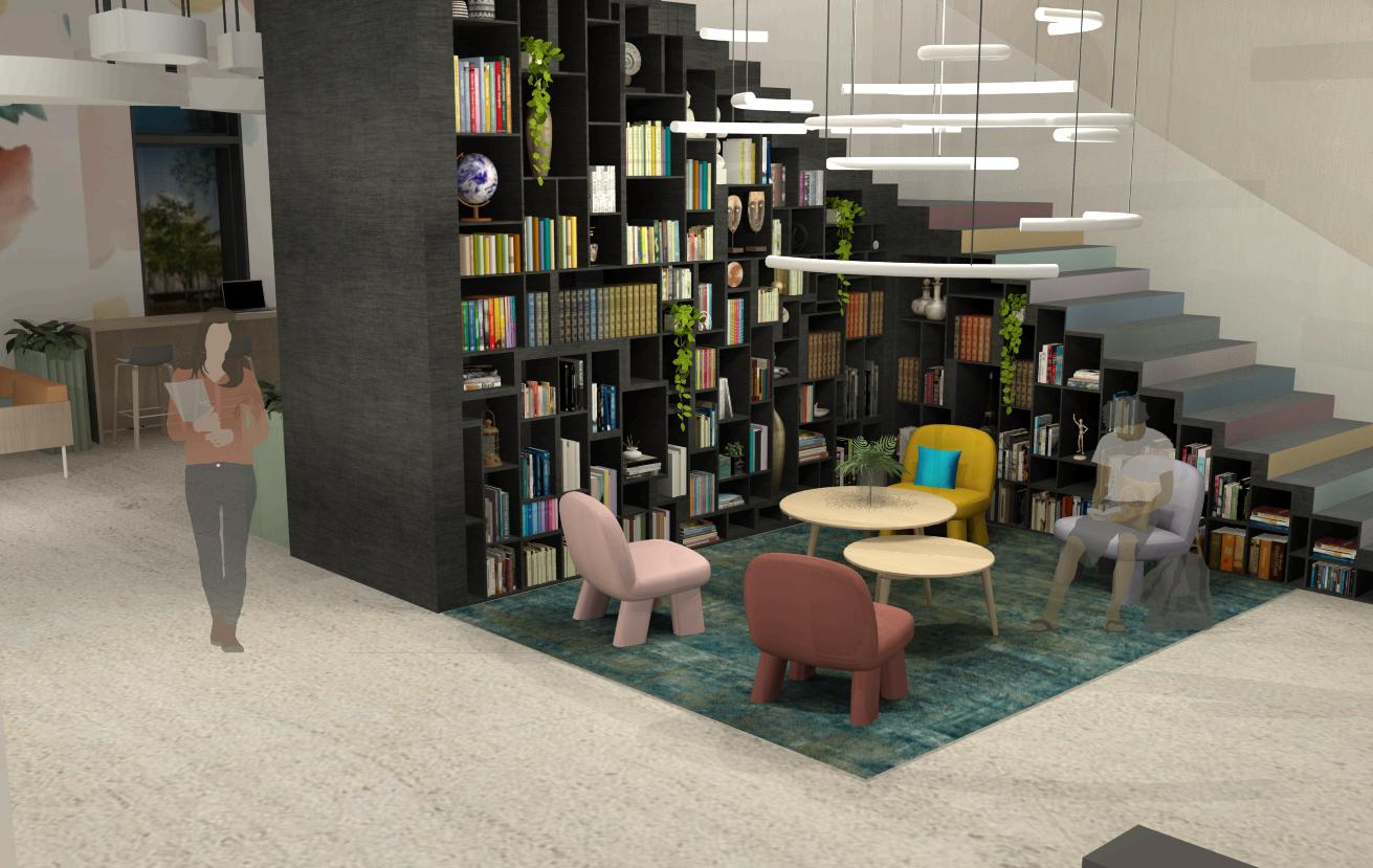 The space was thoughtfully planned to maximize natural light, intuitive wayfinding, and access to resources. The project progressed through schematic design, programming, and contract documentation phases, with an emphasis on ceiling articulation,FF&Eselection,andfinishcoordination.