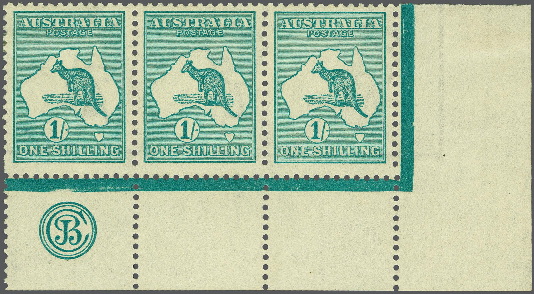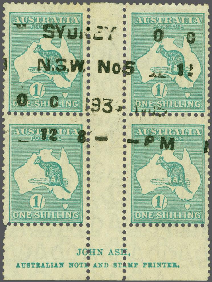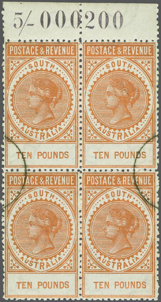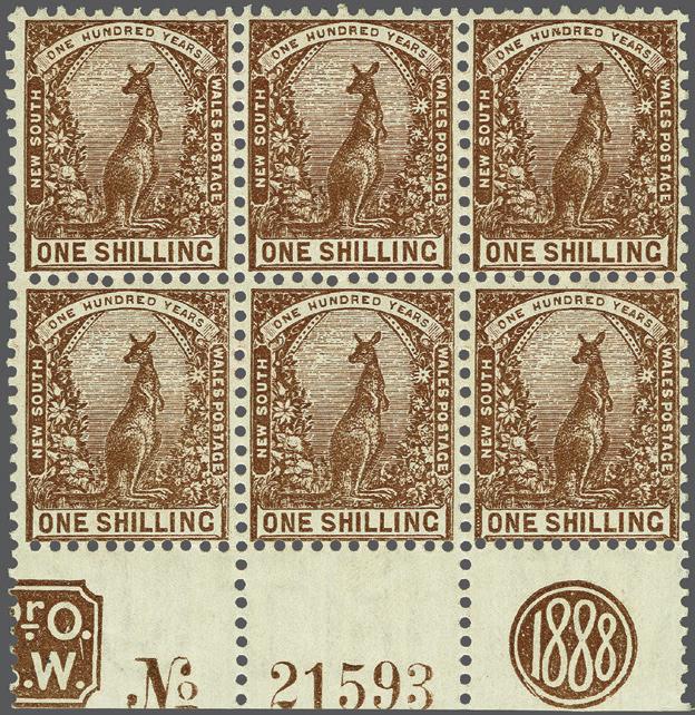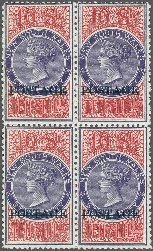 D70 4 100 (€ 105) 1909/10: Postage Due, £ 1 rosine & yellow-green, Die I, wmk. Crown over double lined A, perf. 12 x 12½, a used example, lightly cancelled in Sydney in violet Gi = £ 325 / BW D92 = $ 425. D73 100 (€ 105) 1913/23: Postage Due 1 d. rosine & bright apple-green, wmk. Crown over double lined A, thin paper, perf. 11, a matching used blocks of six from left corner of the sheet with "JBC" Monogram and from right with "CA" Monogram, cancelled by circular "Dundas / NSW" cds's (Jan 18, 1917) in black. Minor marginal blemish but most attractive multiples BW D96z+D96zb.
