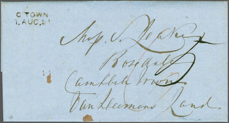 1819 (April 3): Entire letter from one Frederick Drennan in Sydney via England to Capt. de Reynaud of the 60th Regiment at the Cape of Good Hope, endorsed 'fav.d by J. Pincham Esq.' and 'Messrs. Greenwood & Co.', struck in transit with fine step type "HASTINGS / SHIP LETTER" in brown (Robertson S3) with London cds (Oct 19) in red on reverse and rated '1/4d.' due to pay upon arrival (8d. Ship Letter + 8d. for under 80 miles). The letter presumably forwarded on to the Cape as an enclosure by Greenwood & Co. A fine and rare entire.